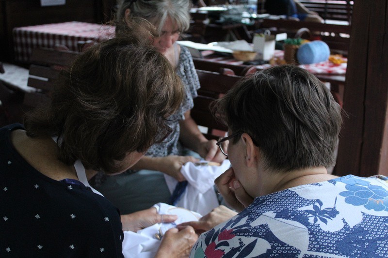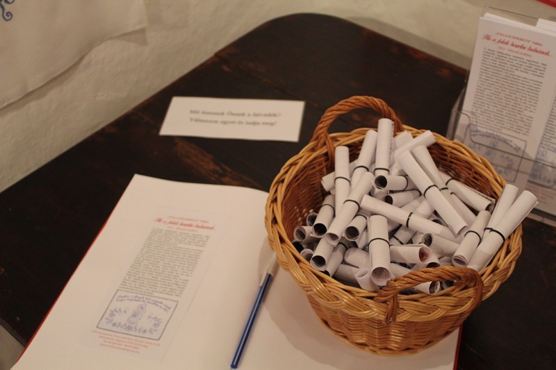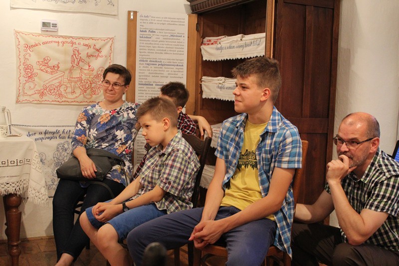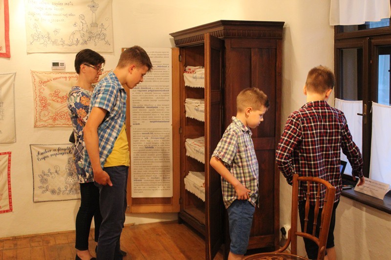 A június 24-én 17:30-tól éjfélig tartó rendezvényt a tájház új időszaki kiállításának (Ha a falak beszélni tudnának…) megnyitásával kezdtük. A dédszüleink, nagyszüleink világát (értékrendjét, vágyálmait, humorát) idéző régi falvédők és különböző hímzett, szöveges textíliák között vannak klasszikus műalkotások leegyszerűsített rajzai, bibliai és Petőfi idézetek, egykoron népszerű magyar nóták szövegrészletei és sok idilli ábrázolás a konyhájával, főztjével büszkélkedő háziasszonyról.