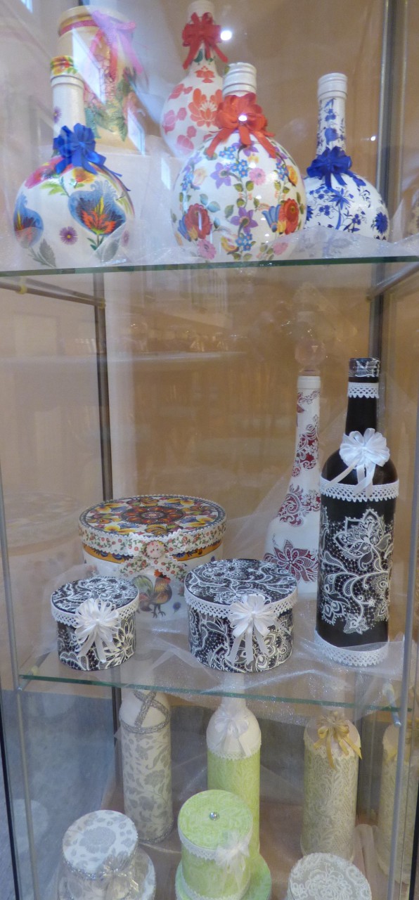 Száradás után kétszer lakkozom, majd díszítem őket. Időnként - ha a minta megkívánja - kézzel festem meg a hiányzó részleteket, illetve motívumokat. Az üvegek díszítéséhez tojáshéjat is szoktam használni.