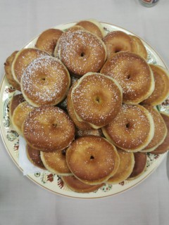 Felforrósítjuk az olajat. Olyan melegnek kell lennie, hogy a fánkok egy-egy oldala 2-3 perc alatt süljön aranybarnára. Ha túl forró az olaj, nem sül át belül a tészta, ha túl hideg, akkor pedig magába szívja az olajat. Amikor megfelelő hőmérsékletű az olaj, akkor a korongok közepét összecsípjük az ujjainkkal és azzal az oldalával felfele tesszük az olajba, amelyik a deszkán feküdt. Az első oldalát mindig fedő alatt sütjük, a második oldalát pedig fedő nélkül. Ha könnyű, laza szerkezetű tésztát dagasztottunk, akkor a fánkok közepe nem ér bele az olajba és egy fehér szalag képződik az oldalán.
