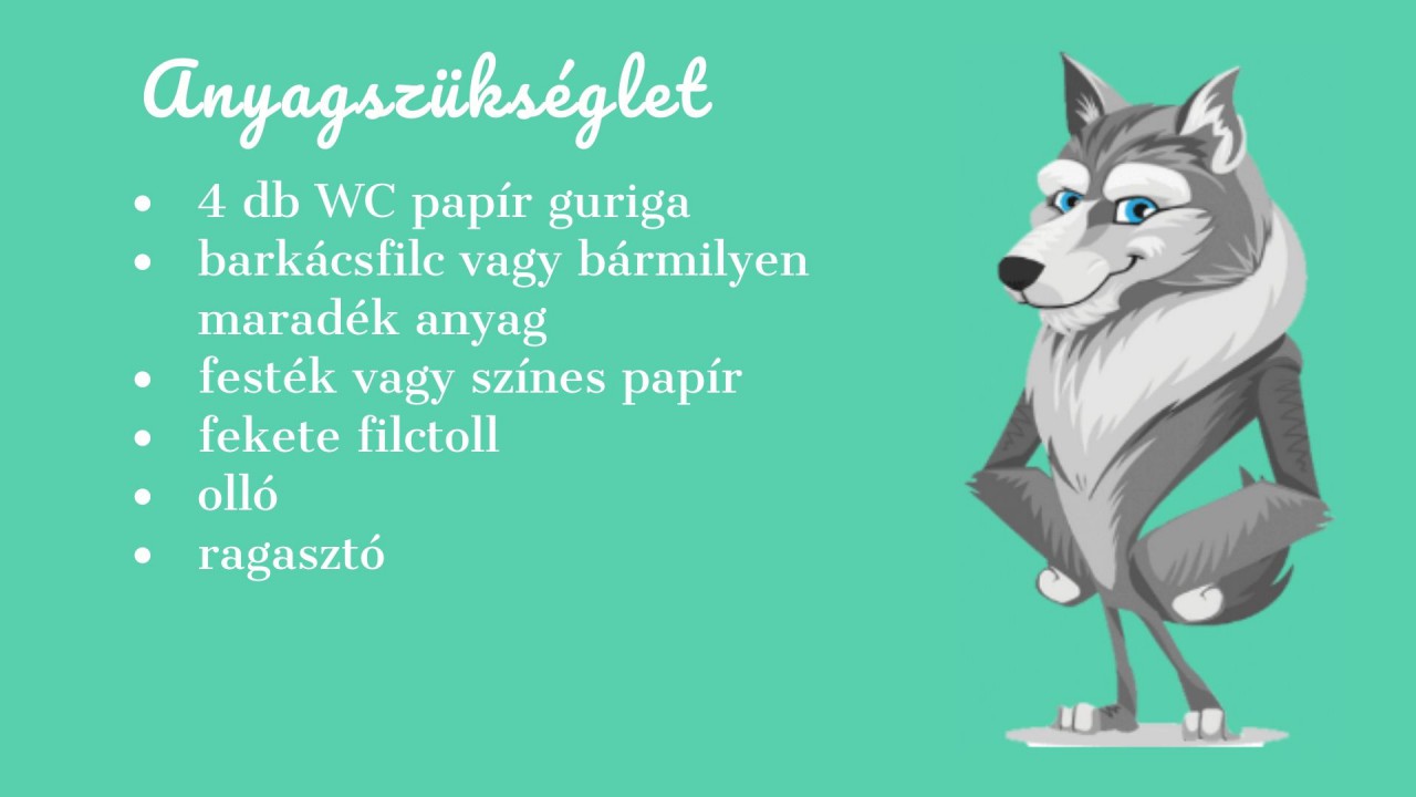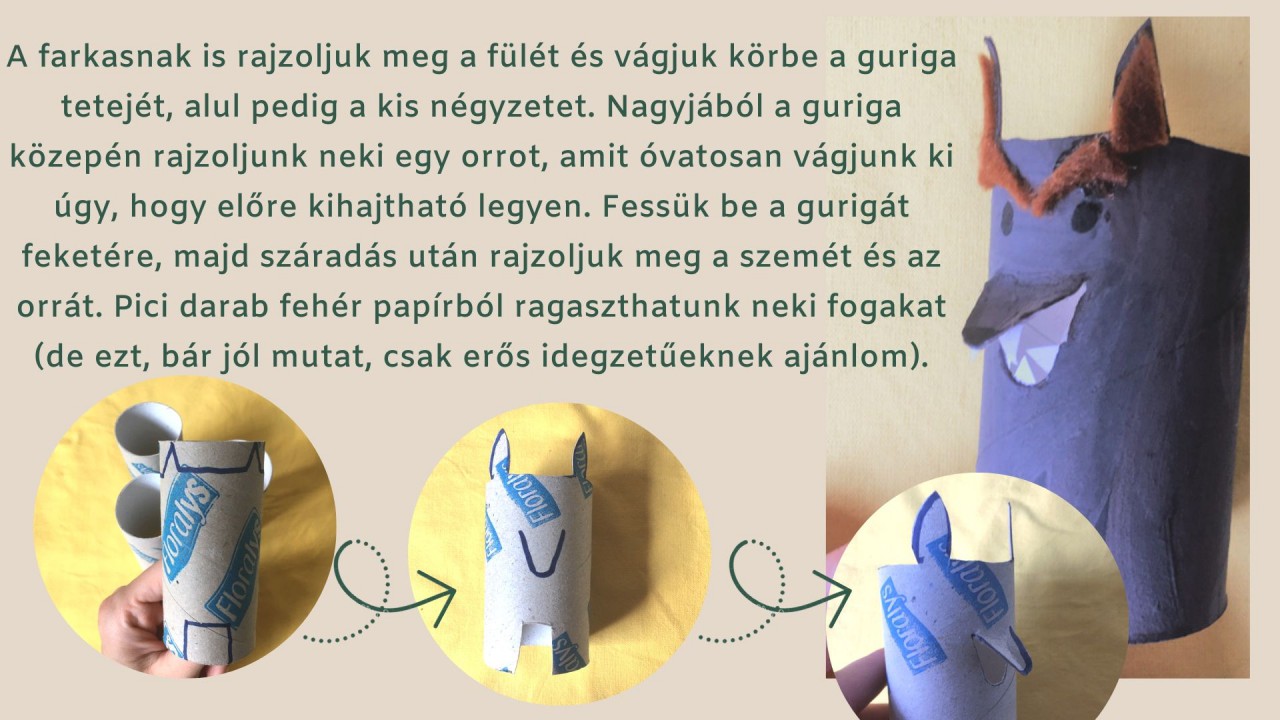 ? A farkasnak is rajzoljuk meg a fülét és vágjuk körbe a guriga tetejét, alul pedig a kis négyzetet. Nagyjából a guriga közepén rajzoljunk neki egy orrot, amit óvatosan vágjunk ki úgy, hogy előre kihajtható legyen. Fessük be a gurigát feketére, majd száradás után rajzoljuk meg a szemét és az orrát. Pici darab fehér papírból ragaszthatunk neki fogakat (de ezt, bár jól mutat, csak erős idegzetűeknek ajánlom).