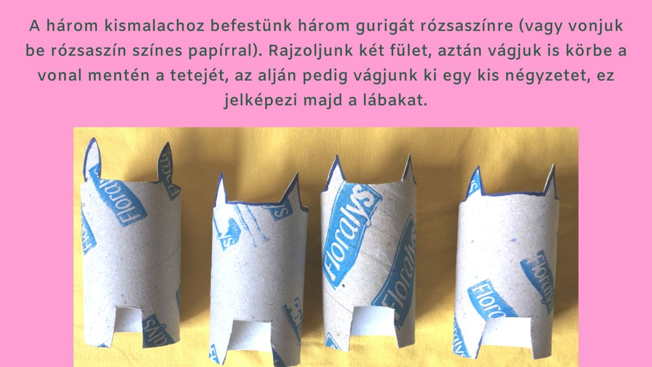 ? A három kismalachoz befestünk három gurigát rózsaszínre (vagy vonjuk be rózsaszín színes papírral). Rajzoljuk két fület, aztán vágjuk is körbe a vonal mentén a tetejét, az alján pedig vágjunk ki egy kis négyzetet, ez jelképezi majd a lábakat. (Ha színes papírt használunk, akkor először vonjuk be a gurigát, és utána vágjuk formára, ha festjük, akkor mindegy a sorrend.)
