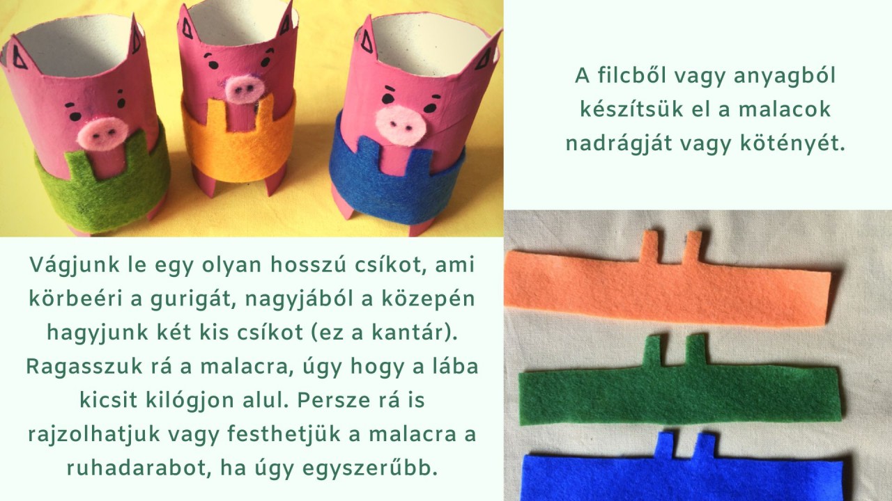 ? A filcből vagy anyagból készítsük el a malacok nadrágját (vagy kötényét az én gyerekeim szerint). Vágjunk le egy olyan hosszú csíkot, ami körbeéri a gurigát, nagyjából a közepén hagyjunk két kis csíkot (ez a kantár). Ragasszuk rá a malacra, úgy hogy a lába kicsit kilógjon alul. Persze rá is rajzolhatjuk vagy festhetjük a malacra a ruhadarabot, ha úgy egyszerűbb.