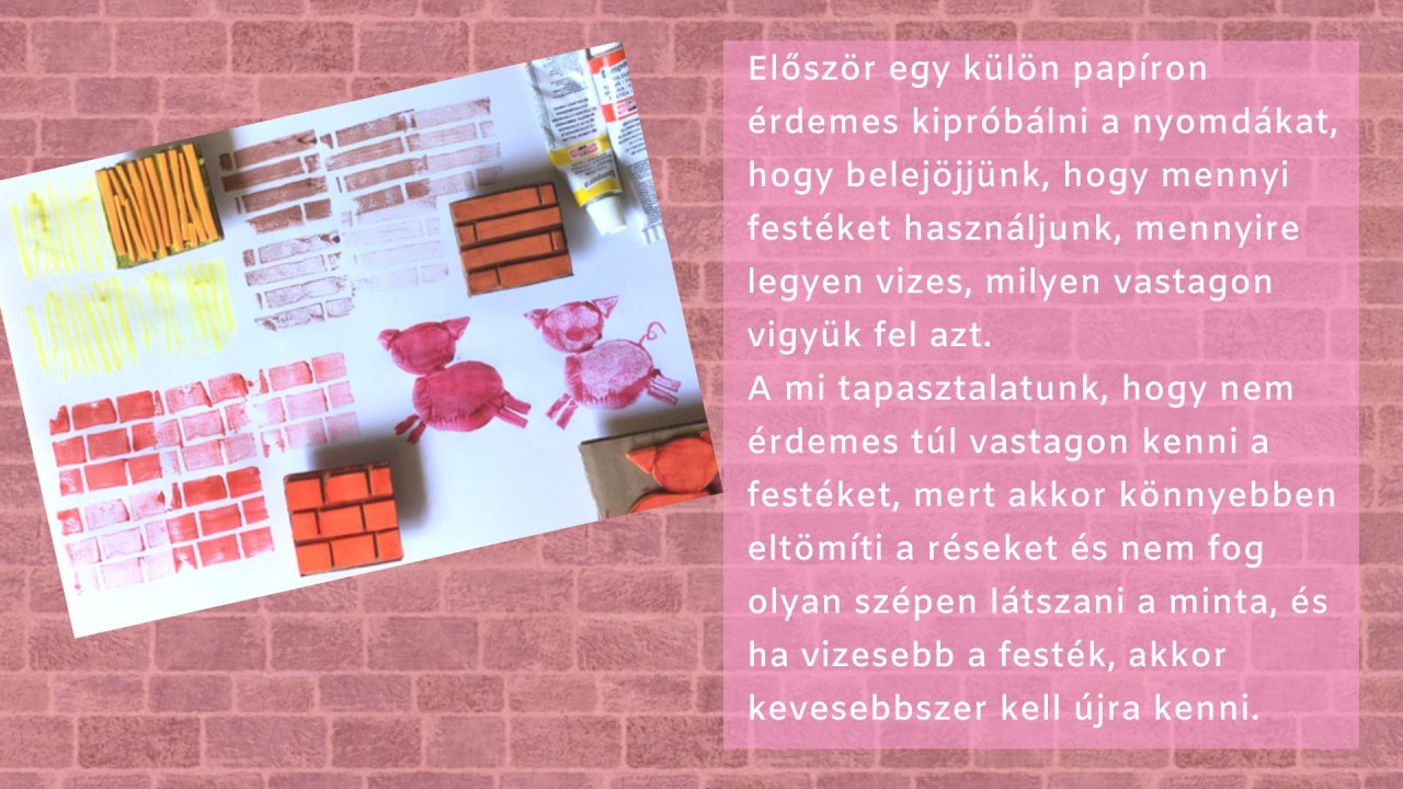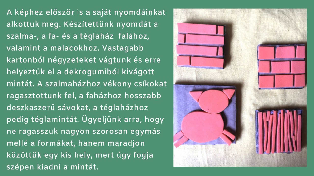 ? Ehhez a képhez először is a saját nyomdáinkat alkottuk meg. Készítettünk nyomdát a szalma-, a fa- és a téglaházfalához, valamint a malacokhoz. Vastagabb kartonból négyzeteket vágtunk és erre helyeztük el a dekrogumiból kivágott mintát. A szalmaházhoz vékony csíkokat ragasztottunk fel, a faházhoz hosszabb deszkaszerű sávokat, a téglaházhoz pedig téglamintát. Ügyeljünk arra, hogy ne ragasszuk nagyon szorosan egymás mellé a formákat, hanem maradjon közöttük egy kis hely, mert úgy fogja szépen kiadni a mintát. A karton hátuljára kupakot ragasztottunk (lehet parafadugót is), ami arra szolgál, hogy rendesen meg lehessen fogni a nyomdát.