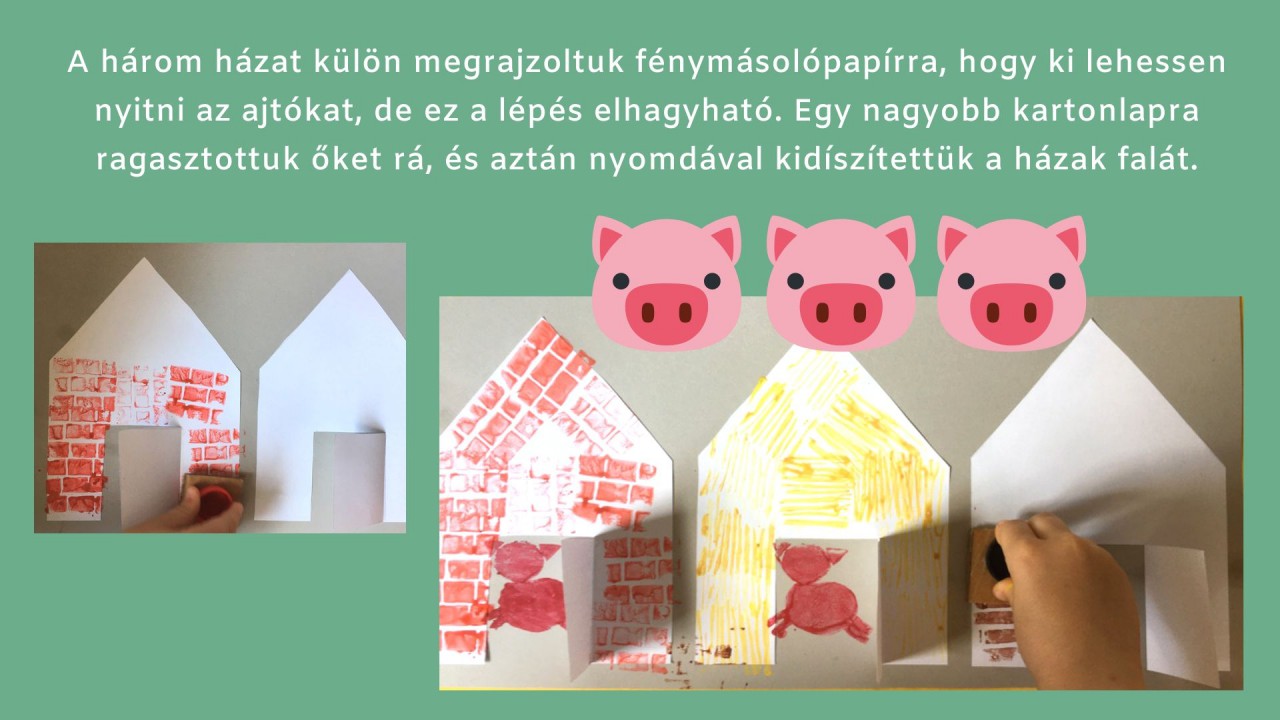 ? Miután készen lettek a házak, az ajtónyílásba elhelyeztük a malacokat, és amikor megszáradt a festék, filctollal megrajzoltuk az arcukat. Nagyobb gyerekek, akik már ügyesen vágnak, még több nyomdát is elkészíthetnek a képhez, mondjuk a felhőket, pillangókat vagy akár a farkast is. Mi a kiegészítőket csak felrajzoltuk és az ujjunkkal festettük ki.