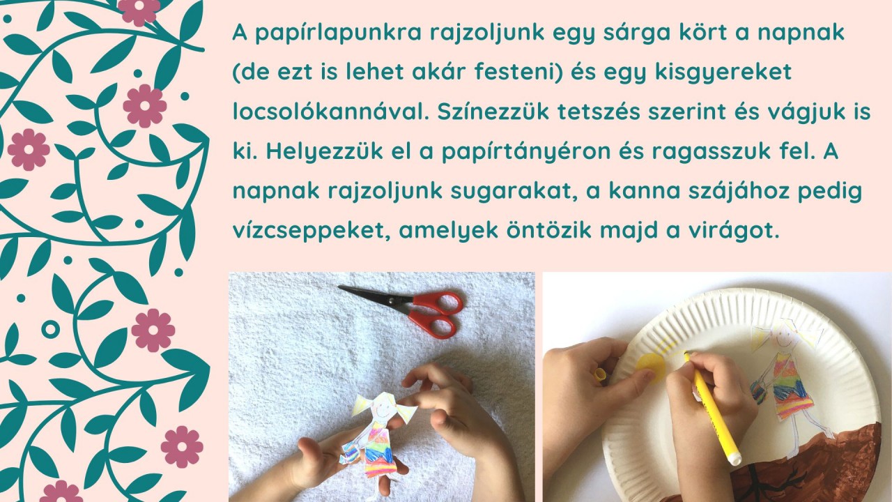 ? A papírlapunkra rajzoljunk egy sárga kört a napnak (de ezt is lehet akár festeni) és egy kisgyereket locsolókannával. Színezzük tetszés szerint és vágjuk is ki. Helyezzük el a papírtányéron és ragasszuk fel. A napnak rajzoljunk sugarakat, a kanna szájához pedig vízcseppeket, amelyek öntözik majd a virágot.