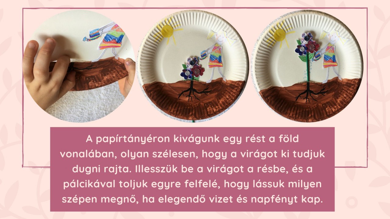 ? A papírtányéron kivágunk egy rést a föld vonalában, olyan szélesen, hogy a virágot ki tudjuk dugni rajta. Illesszük be a virágot a résbe, és a pálcikával toljuk egyre felfelé, hogy lássuk milyen szépen megnő, ha elegendő vizet és napfényt kap.