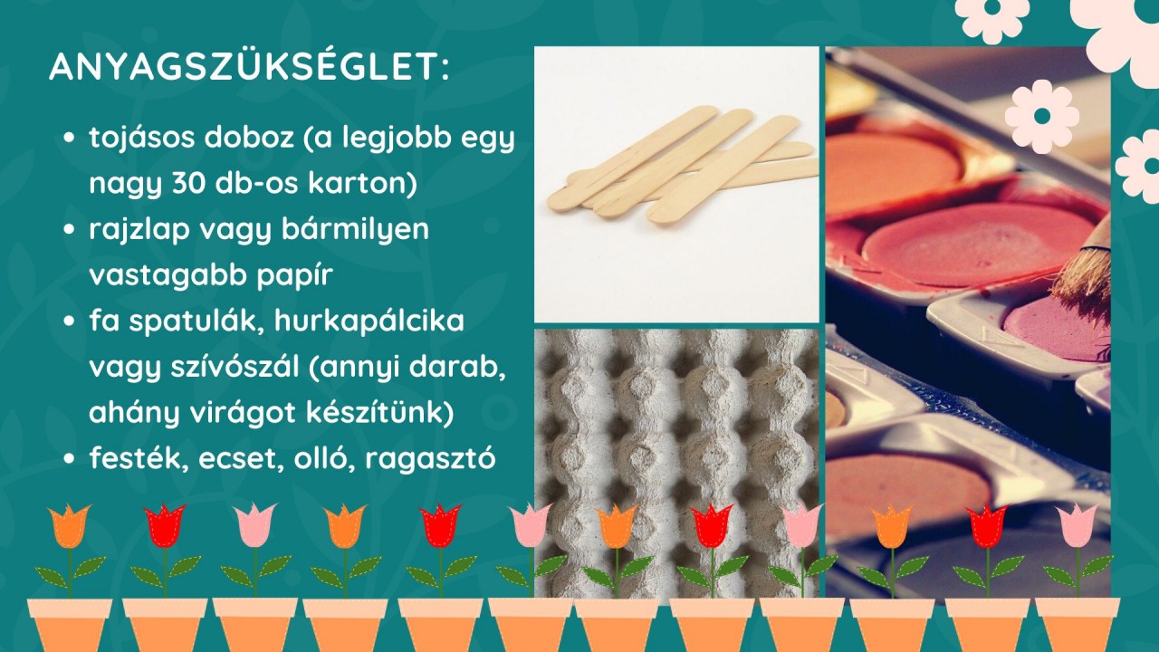 ? Fessük be zöldre a szárnak való spatulákat, hurkapálcikákat vagy szívószálakat. (A pálcikákat törjük vagy vágjuk akkora méretre, amekkora szárat szeretnénk a virágoknak.) Fessük be zöldre a tojásos doboz alját is. Természetesen lehet kisebb dobozt is használni, a sima 10 db-os tartóból is szép kiskertünk lehet, ekkor csukjuk össze a dobozt, fordítsuk úgy, hogy az alja nézzen fölfelé, és azt fessük be zöldre. A 30 db-os tartót is vághatjuk kisebb részekre, attól függően, hogy mennyi virágot szeretnénk készíteni (és mennyi türelme van a gyereknek, mi úgy csináltuk, hogy egy hétig minden nap foglalkoztunk vele valamennyit, így nem unta meg.)