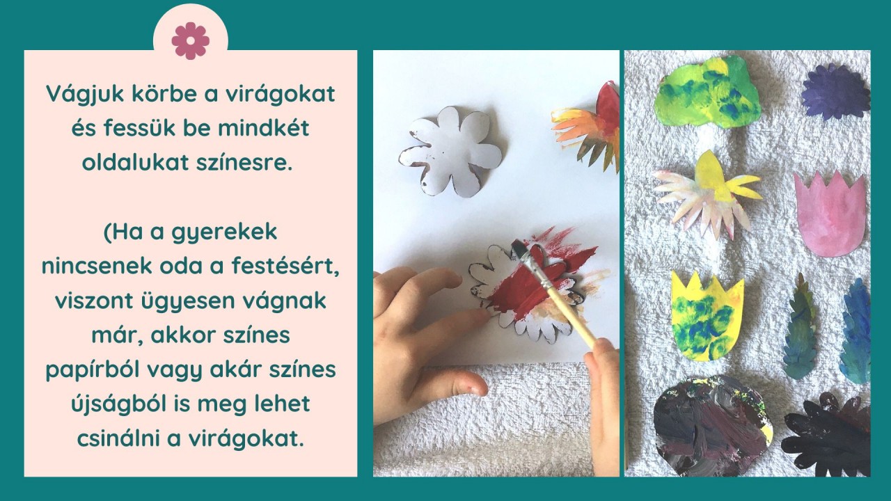 ? Vágjuk körbe a virágokat és fessük be mindkét oldalukat színesre. (Ha a gyerekek nincsenek oda a festésért, viszont ügyesen vágnak már, akkor színes papírból vagy akár színes újságból is meg lehet csinálni a virágokat. Én a kiscsoportos fiammal alkottam meg ezt a kertet, aki nagyon szeret festeni, a vágásban viszont még van hova fejlődnie, úgyhogy ez alapján osztottuk fel a feladatokat.)