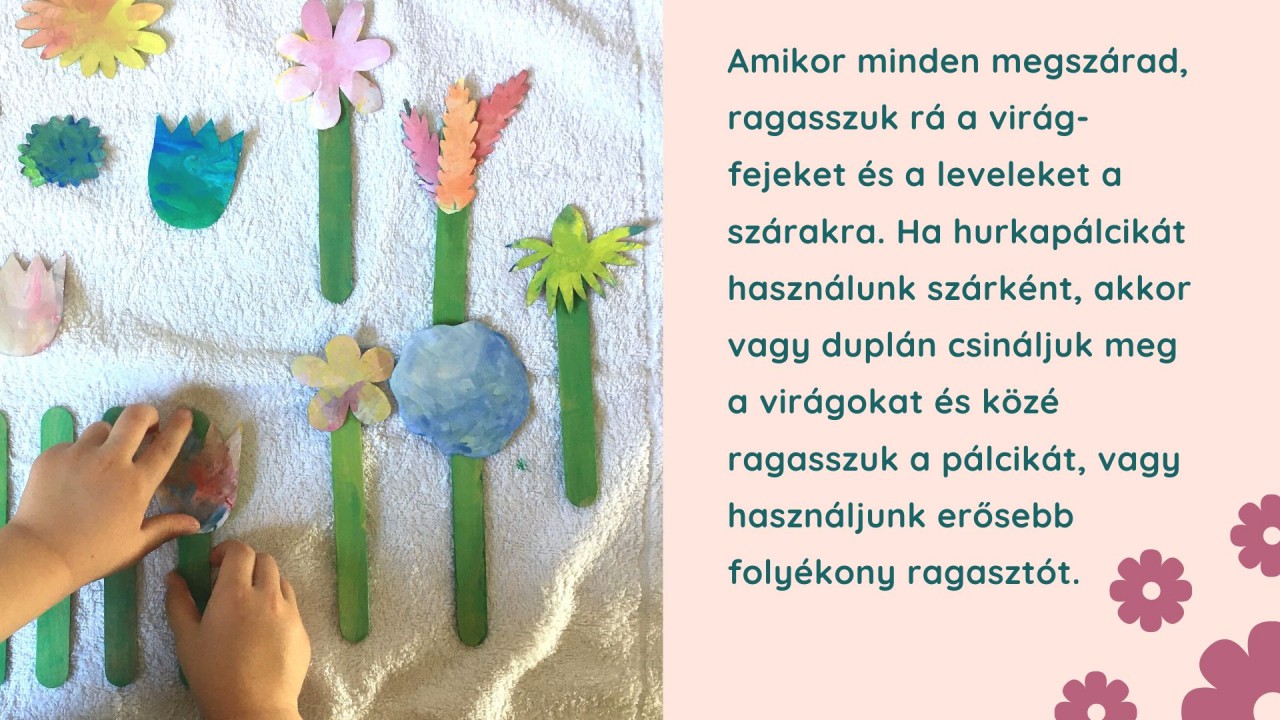 ? Amikor minden megszárad, ragasszuk rá a virágfejeket és a leveleket a szárakra. Ha hurkapálcikát használunk szárként, akkor vagy duplán csináljuk meg a virágokat és közé ragasszuk a pálcikát, vagy használjunk erősebb folyékony ragasztót (mi azokat technokollal ragasztottuk), hogy ne potyogjanak le a fejek.
