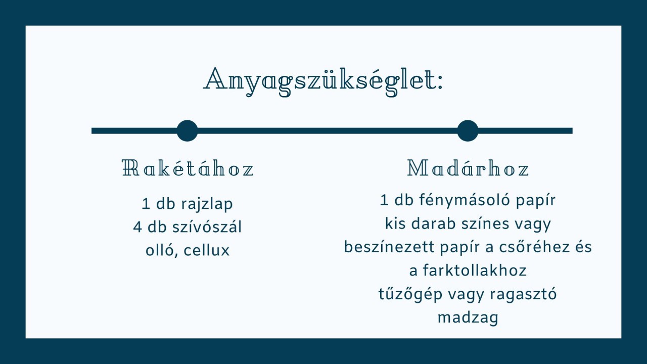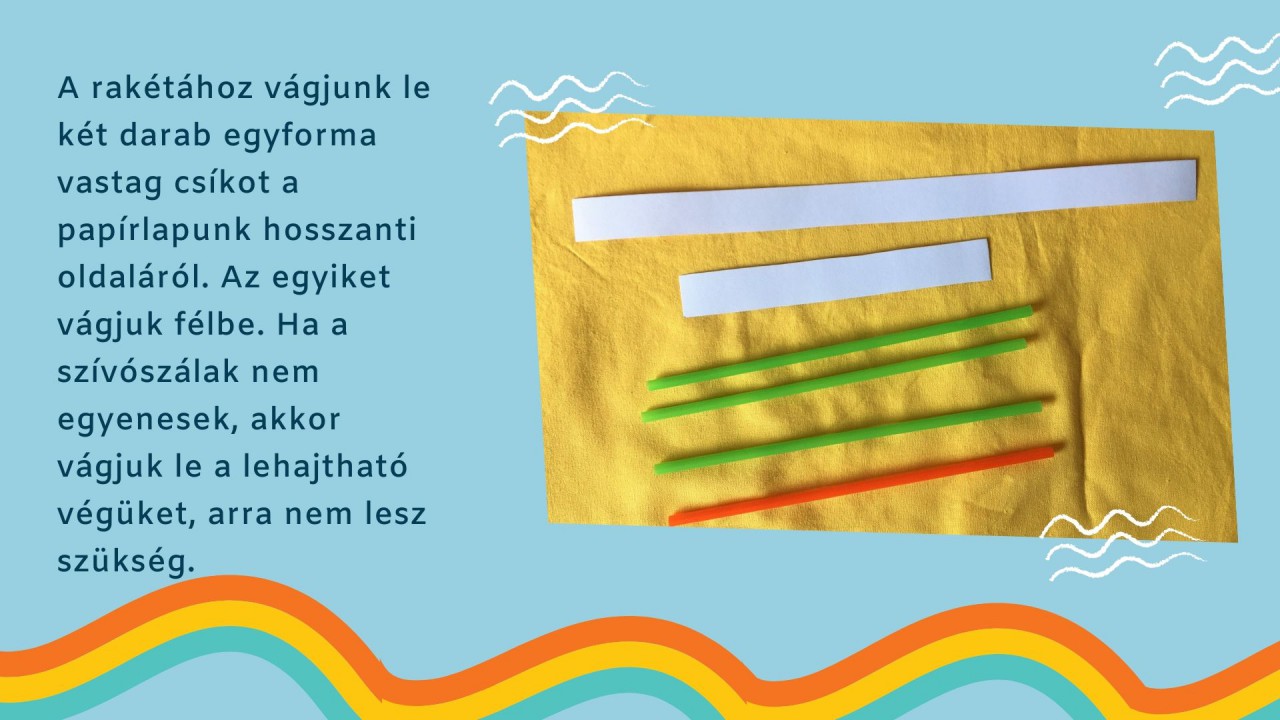? A rakétához vágjunk le két darab egyforma vastag csíkot a papírlapunk hosszanti oldaláról. Az egyiket vágjuk félbe. Ha a szívószálak nem egyenesek, akkor vágjuk le a lehajtható végüket, arra nem lesz szükség.