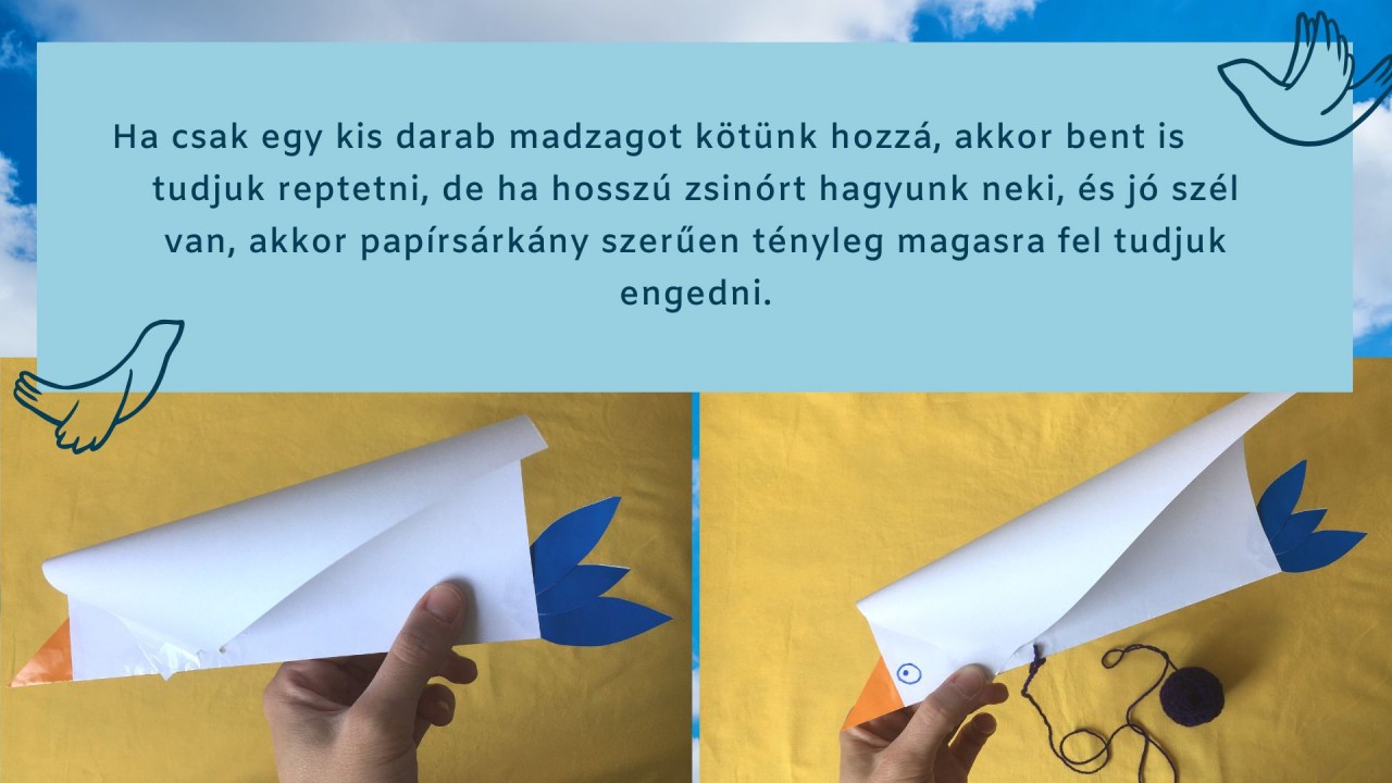 ? A színes papírból vágjunk ki egy háromszöget és ragasszuk a madár elejére a hajtás közé, ez lesz a csőre. Vágjunk ki néhány farktollat is és ragasszuk be hasonló módon a madár másik végébe. Rajzoljunk neki szemet, kössünk hozzá madzagot és kész is. Ha csak egy kis darab madzagot kötünk hozzá, akkor bent is tudjuk reptetni, de ha hosszú zsinórt hagyunk neki, és jó szél van, akkor papírsárkány szerűen tényleg magasra fel tudjuk engedni.