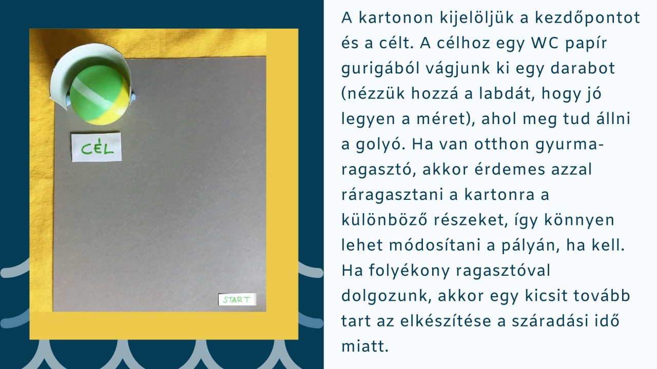 ⚓️ A kartonon kijelöljük a kezdőpontot és a célt. A célhoz egy WC papír gurigából vágjunk ki egy darabot (nézzük hozzá a labdát, hogy jó legyen a méret), ahol meg tud állni a golyó. Ha van otthon gyurmaragasztó, akkor érdemes azzal ráragasztani a kartonra a különböző részeket, így könnyen lehet módosítani a pályán, ha kell. Ha folyékony ragasztóval dolgozunk, akkor egy kicsit tovább tart az elkészítés a száradási idő miatt.
