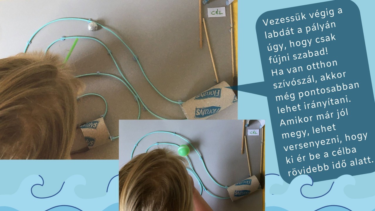 ⚓️ WC papír gurigából (vagy meghajlított papírból) készíthetünk még alagutakat az útra (csak arra figyeljünk, hogy a golyó átférjen rajta), és kezdődhet is a játék. Vezessük végig a labdát a pályán úgy, hogy csak fújni szabad! Ha van otthon szívószál, akkor még pontosabban lehet irányítani. Amikor már jól megy, lehet versenyezni, hogy ki ér be a célba rövidebb idő alatt.