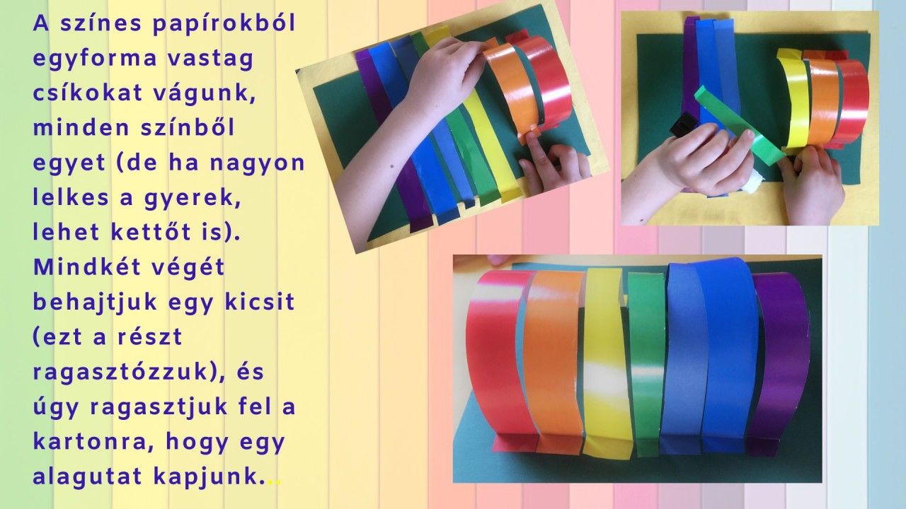 ? A színes papírokból egyforma vastag csíkokat vágunk, minden színből egyet (de ha nagyon lelkes a gyerek, lehet kettőt is). Mindkét végét behajtjuk egy kicsit (ezt a részt ragasztózzuk), és úgy ragasztjuk fel a kartonra, hogy egy alagutat kapjunk.