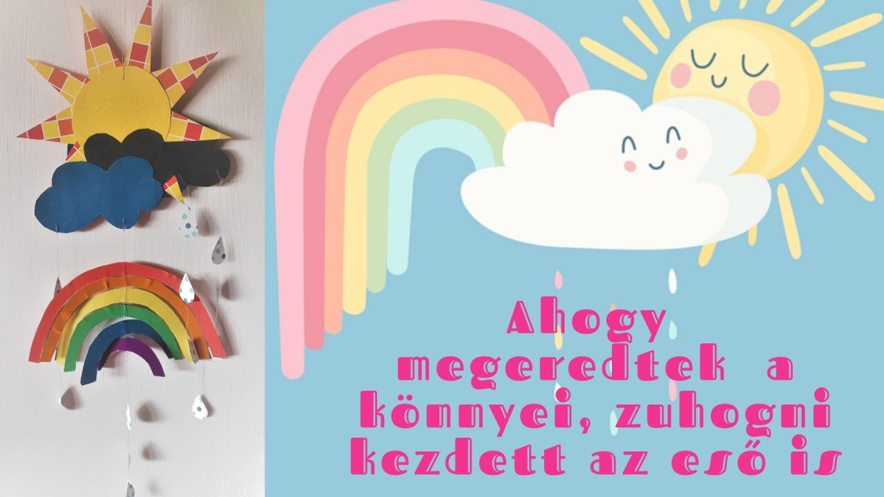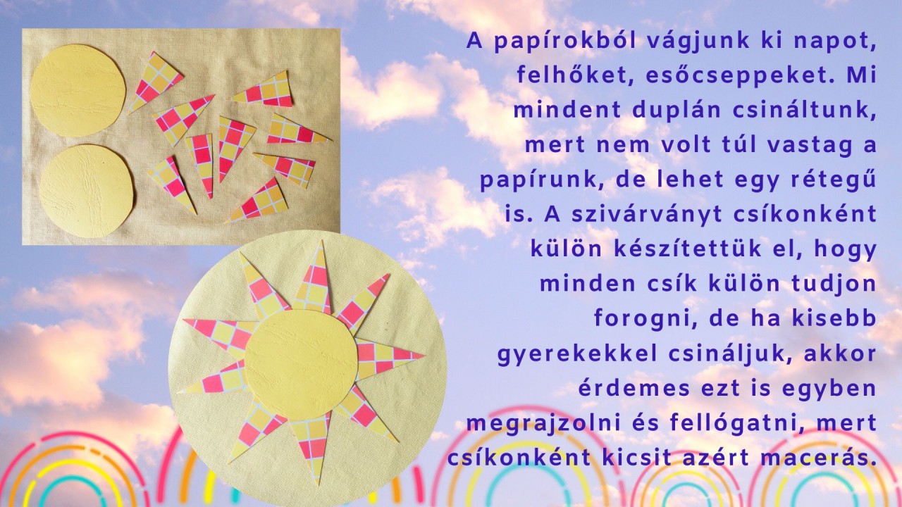 ? A papírokból vágjunk ki napot, felhőket, esőcseppeket. Mi mindent duplán csináltunk, mert nem volt túl vastag a papírunk, de lehet egy rétegű is. A szivárványt csíkonként külön készítettük el, hogy minden csík külön tudjon forogni, de ha kisebb gyerekekkel csináljuk, akkor érdemes ezt is egyben megrajzolni és fellógatni, mert csíkonként kicsit azért macerás.