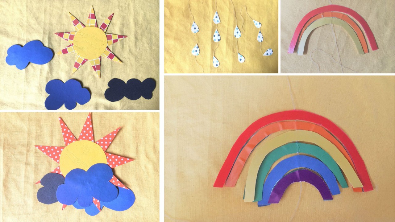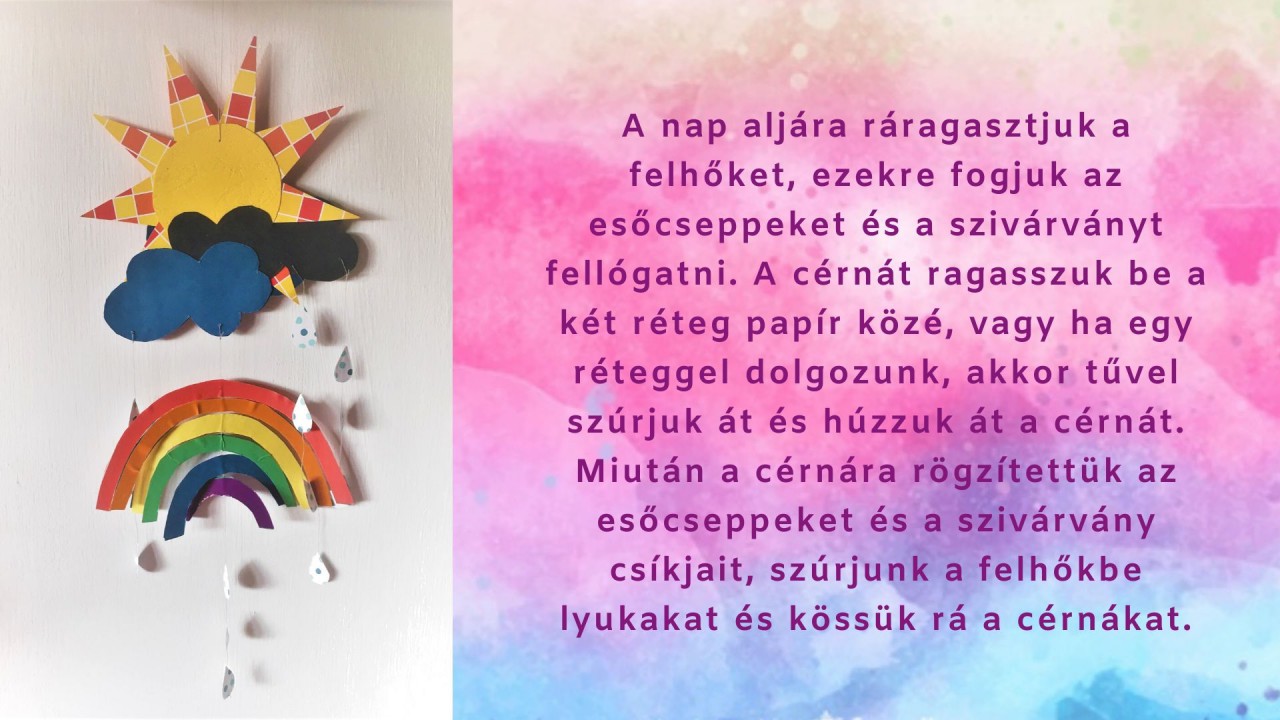 ? A nap aljára ráragasztjuk a felhőket, ezekre fogjuk az esőcseppeket és a szivárványt fellógatni. A cérnát ragasszuk be a két réteg papír közé, vagy ha egy réteggel dolgozunk, akkor tűvel szúrjuk át és húzzuk át a cérnát. Miután a cérnára rögzítettük az esőcseppeket és a szivárvány csíkjait, szúrjunk a felhőkbe lyukakat és kössük rá a cérnákat.