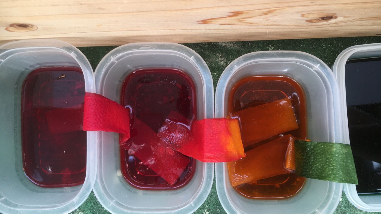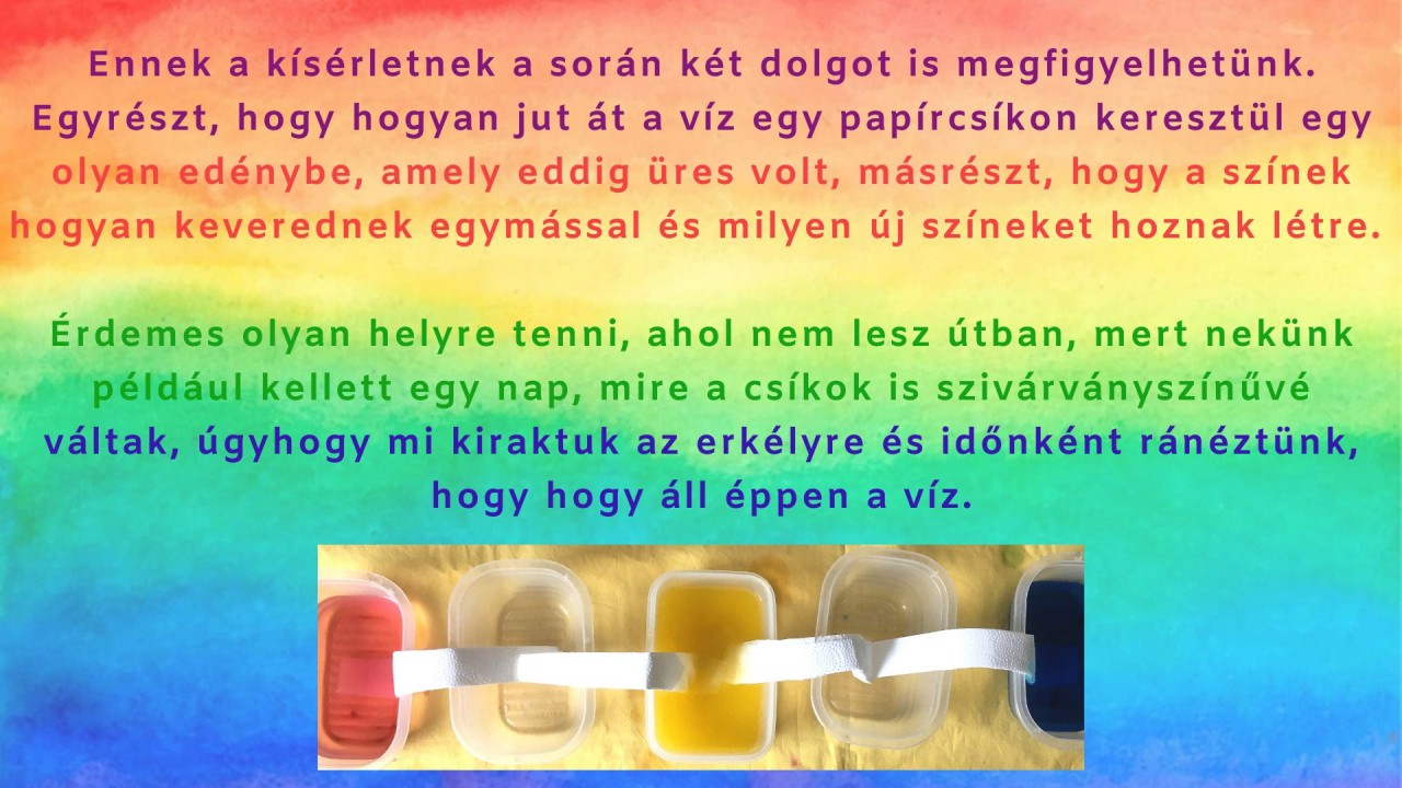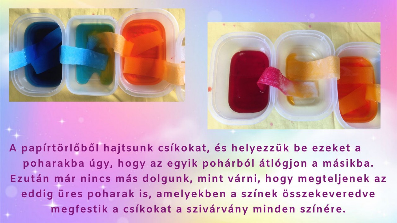? Ennek a kísérletnek a során két dolgot is megfigyelhetünk. Egyrészt, hogy hogyan jut át a víz egy papírcsíkon keresztül egy olyan edénybe, amely eddig üres volt, másrészt, hogy a színek hogyan keverednek egymással és milyen új színeket hoznak létre. Érdemes olyan helyre tenni, ahol nem lesz útban, mert nekünk például kellett egy nap, mire a csíkok is szivárványszínűvé váltak, úgyhogy mi kiraktuk az erkélyre és időnként ránéztünk, hogy hogy áll éppen a víz.