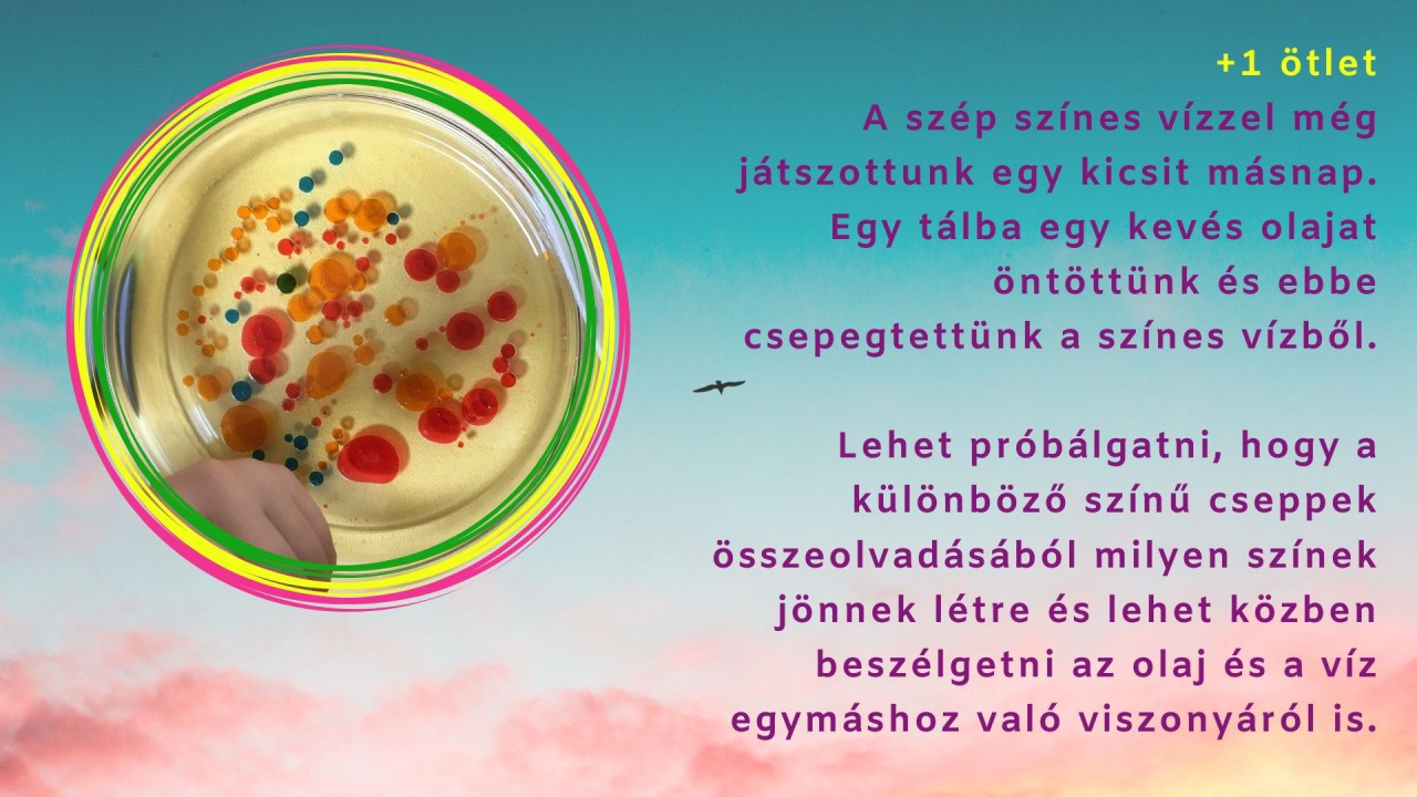 ? +1 A szép színes vízzel még játszottunk egy kicsit másnap. Egy tálba egy kevés olajat öntöttünk és ebbe csepegtettünk a színes vízből. Lehet próbálgatni, hogy a különböző színű cseppek összeolvadásából milyen színek jönnek létre és lehet közben beszélgetni az olaj és a víz egymáshoz való viszonyáról is.