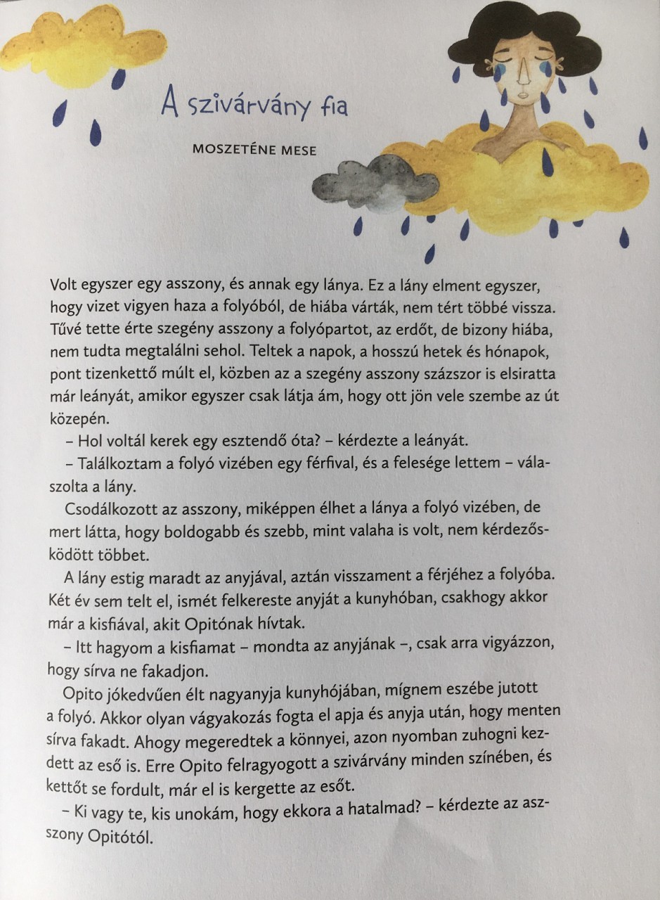 Minden népnek megvannak a magyarázatai a világban előforduló jelenségekre, kérdésekre. Ebben a moszeténe mesében például a szivárvány egy kisfiú, aki a patakban lakik. (Népmesekincstár, Így megyek az iskolába – Bajzáth Mária válogatása). Ismerjétek meg a történetét.