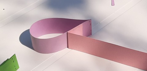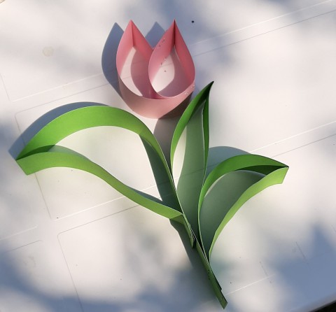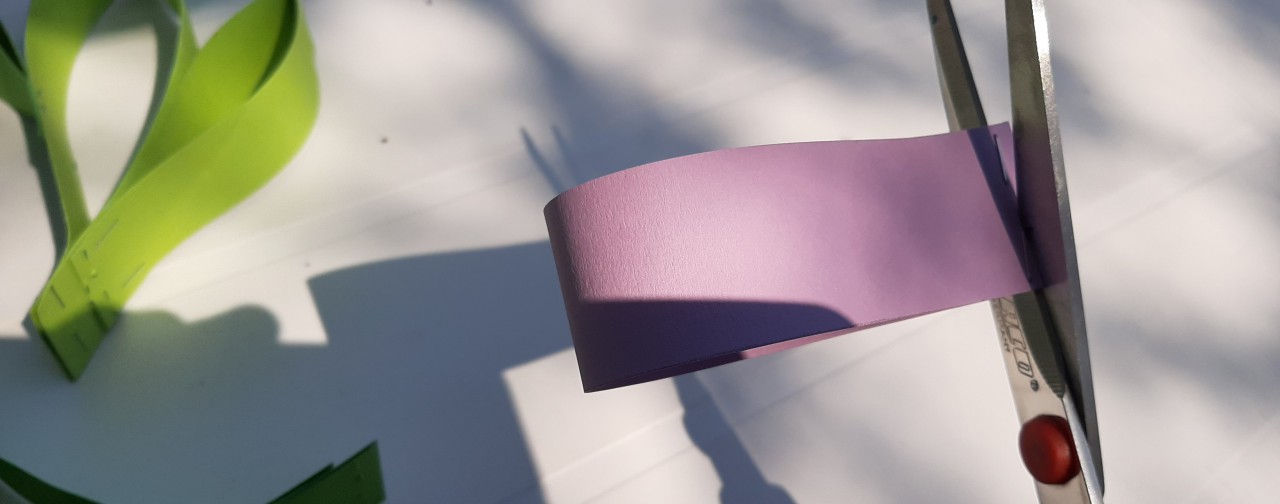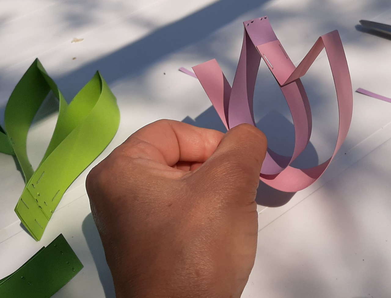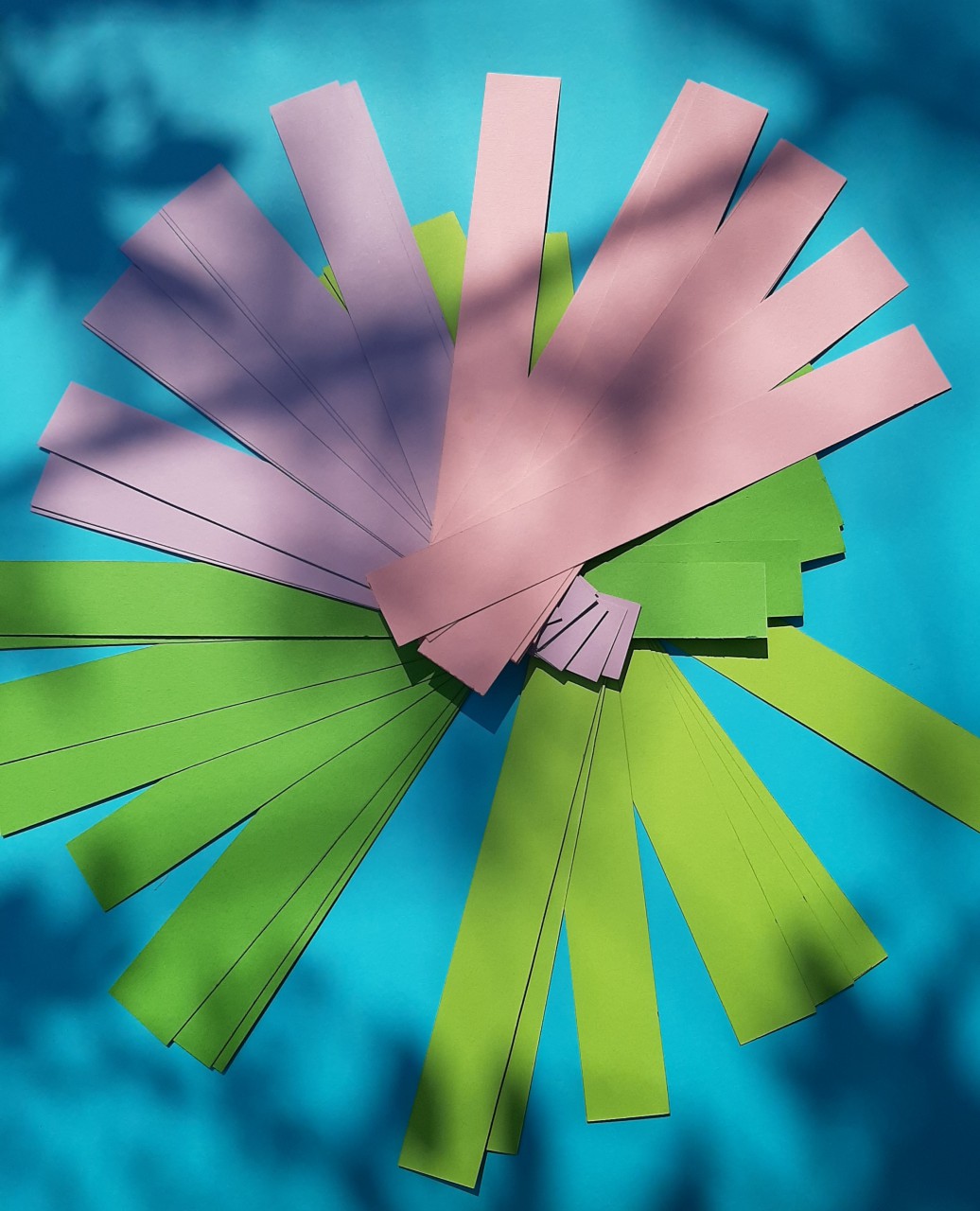 ? A zöld és rózsaszín papírokat csíkokra vágjuk, a rózsaszínűt a rövidebb oldalán osztjuk, a zöldet a hosszabb oldalán osztjuk 3 cm-es csíkokra. A virág részt a rózsaszín csíkból készítjük, a tűzőgép segítségével összetűzzük a mellékelt ábra szerint. A leveleket szintén összetűzzük.