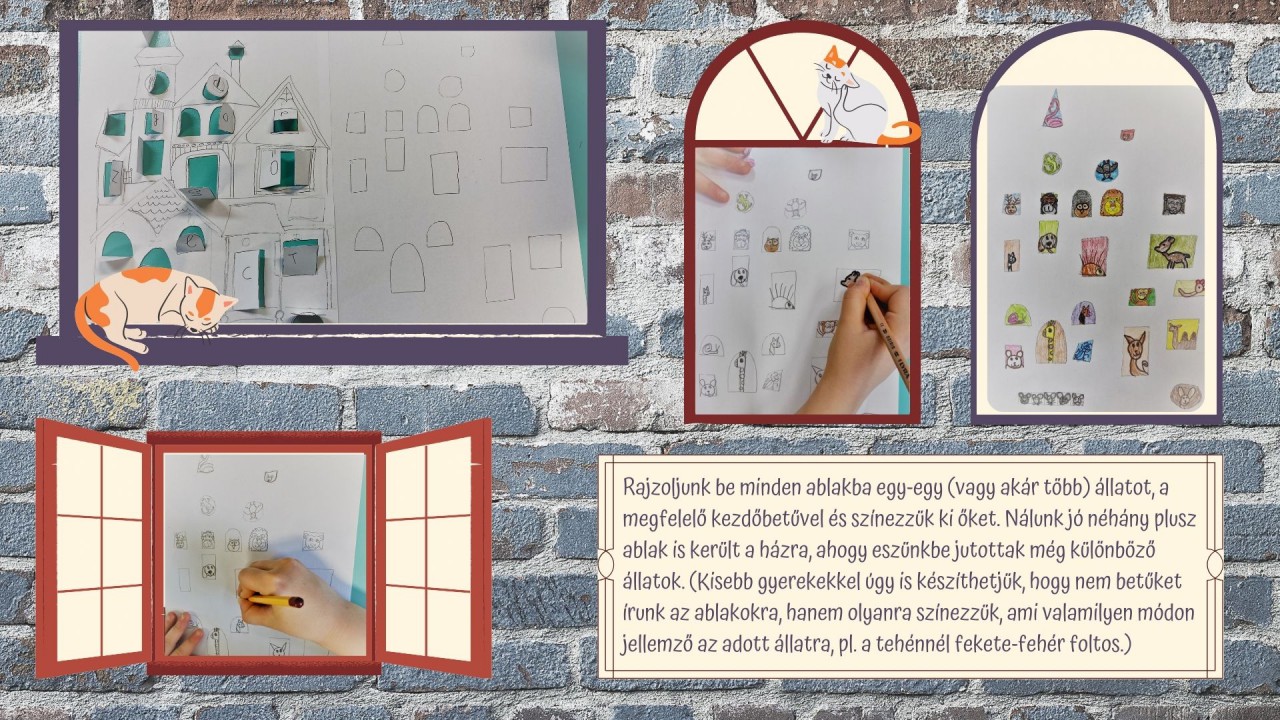 - Rajzoljunk be minden ablakba egy-egy (vagy akár több) állatot, a megfelelő kezdőbetűvel és színezzük ki őket. Nálunk jó néhány plusz ablak is került a házra, ahogy eszünkbe jutottak még különböző állatok. (Kisebb gyerekekkel úgy is készíthetjük, hogy nem betűket írunk az ablakokra, hanem olyanra színezzük, ami valamilyen módon jellemző az adott állatra, pl. a tehénnél fekete-fehér foltos.)