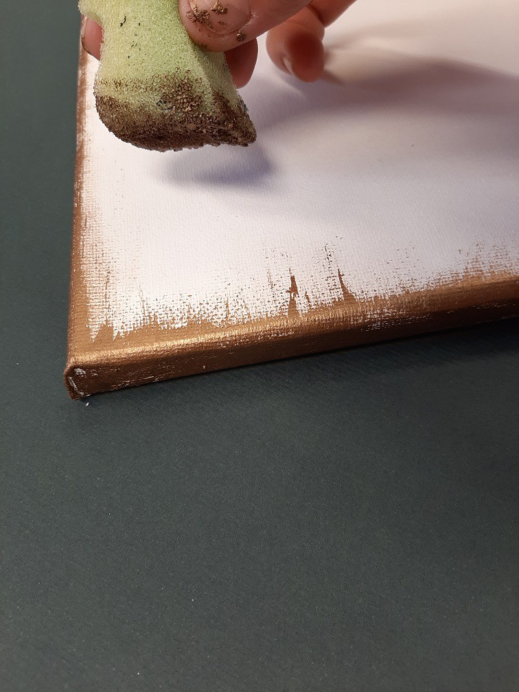? Első lépésként egy szivacs segítségével felvisszük az arany festéket a vászon szélére, mintegy keretet képezve majd a festményünknek.