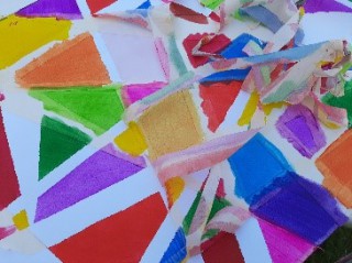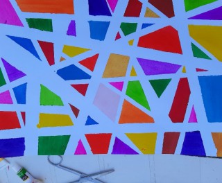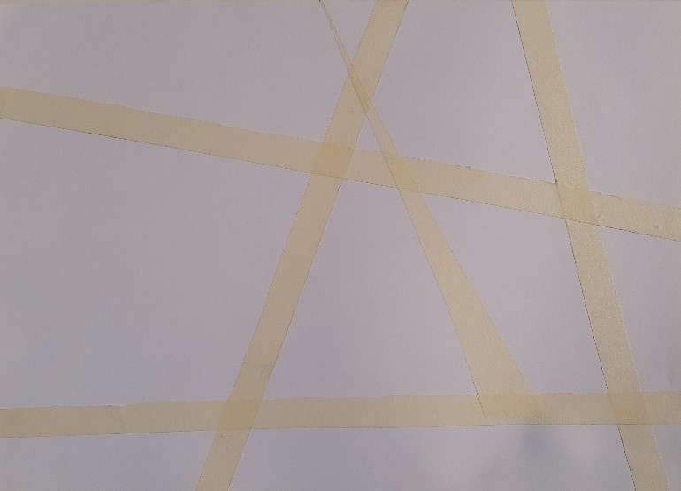 ? A maszkoló fóliából csíkokat vágunk, melyeket tetszőlegesen ráragasztunk a papírra. Ha vastagabb ragasztószalag van otthon, akkor ollóval szétvágjuk.