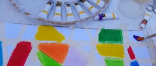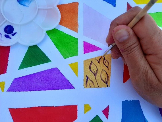 ? A vastag ecsetet vesszük elő, azzal festjük a kimaszkolt felületeket. Festésnél ügyeljünk arra, hogy ne fessünk bele a másik kimaszkolt részbe. Ha ezzel készen vagyunk és a festék megszáradt, lehúzhatjuk a lapról a szalagokat.