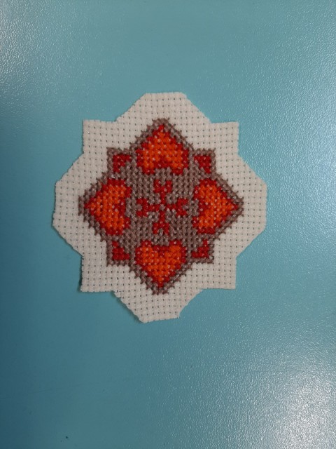 ❌ Ha kész vagyunk kivágjuk a díszt a kivarrt minta mentén, majd lakkal lefújjuk és száradás után a hátuljára ragasztjuk a zsinórt, melyen függeni fog a dísz.