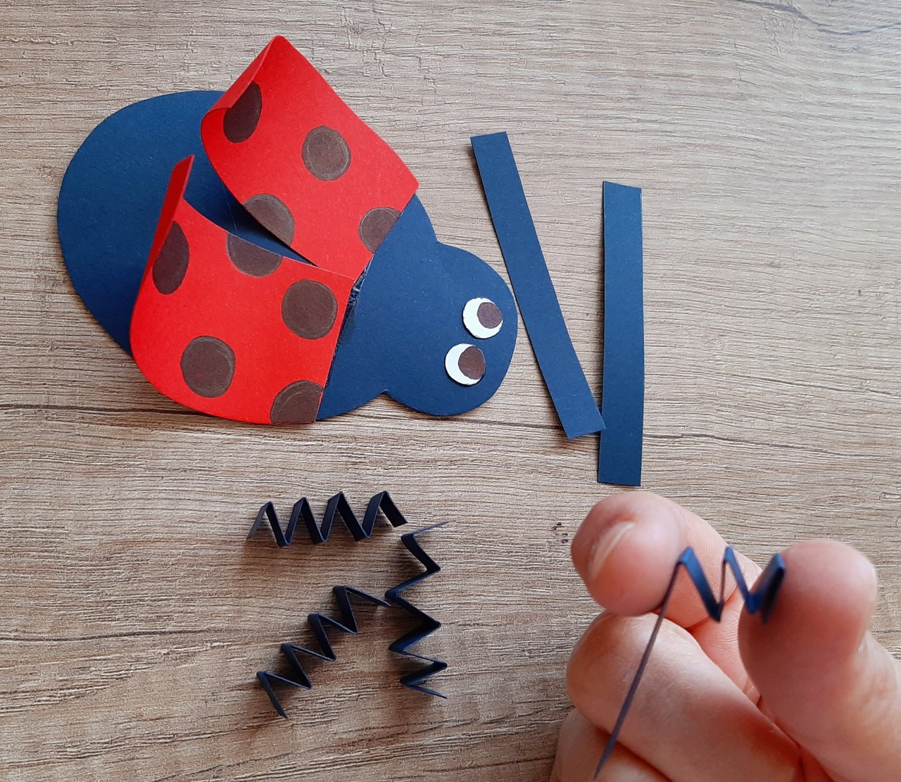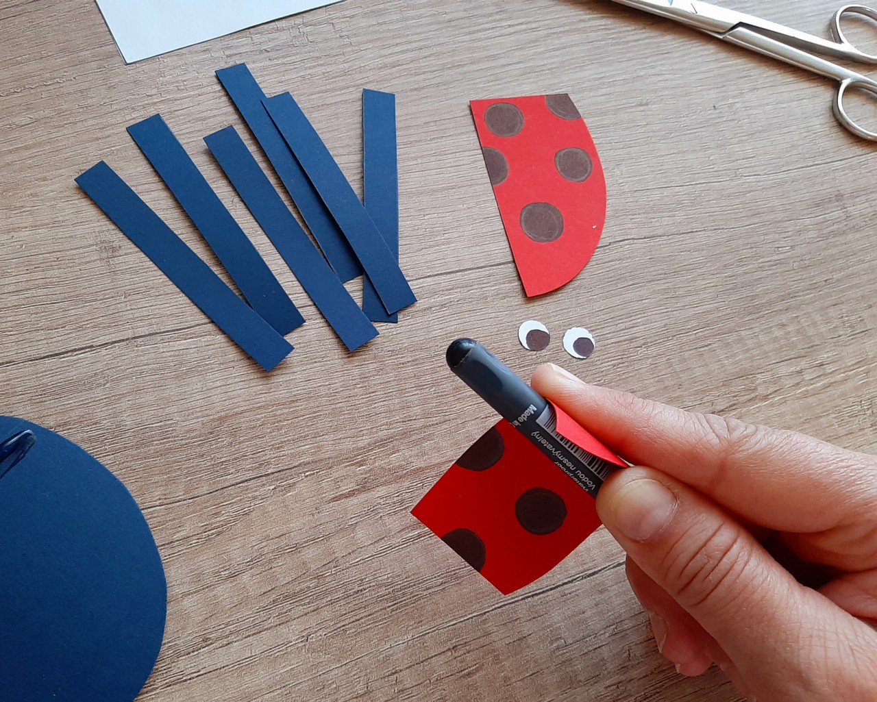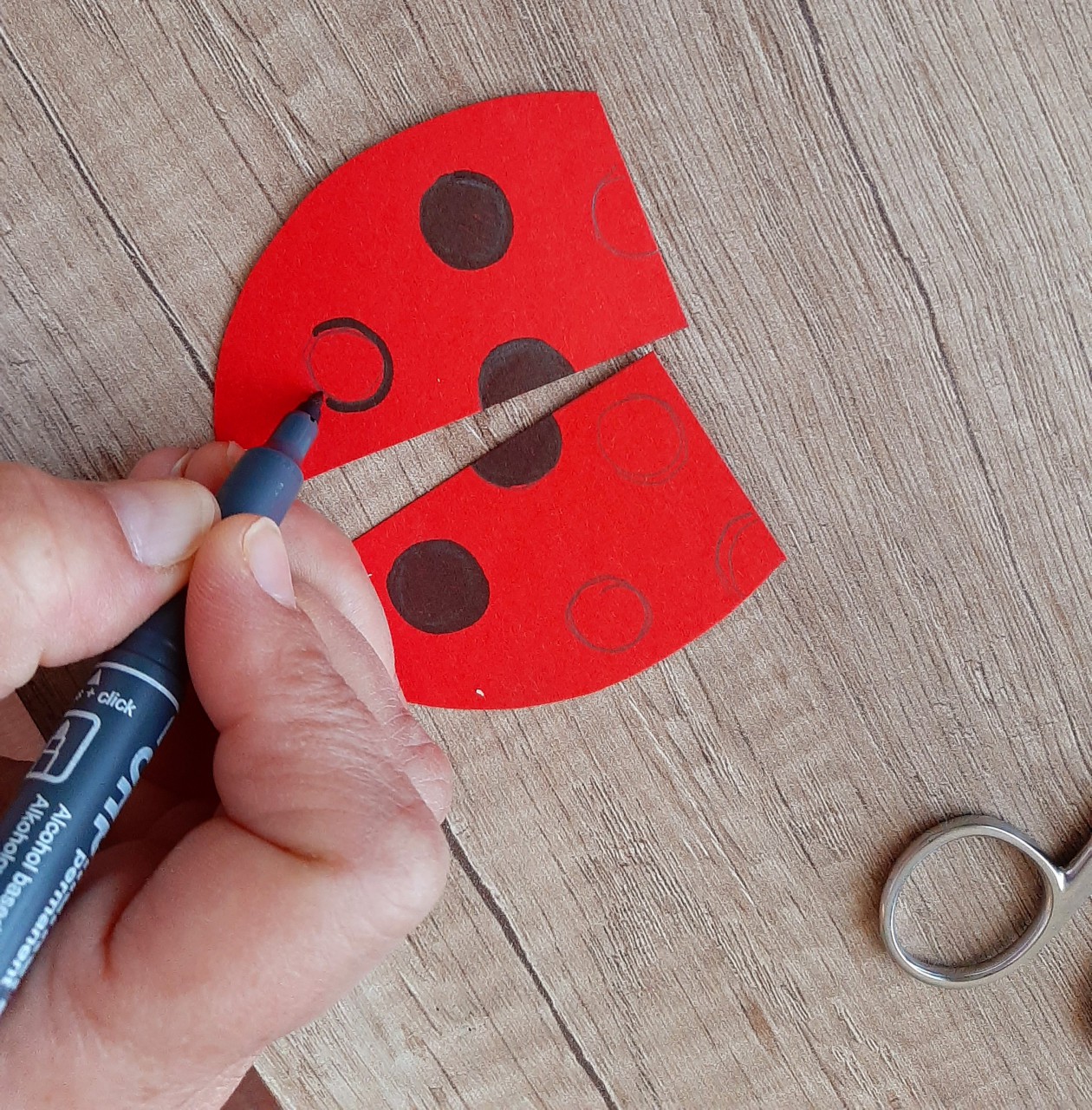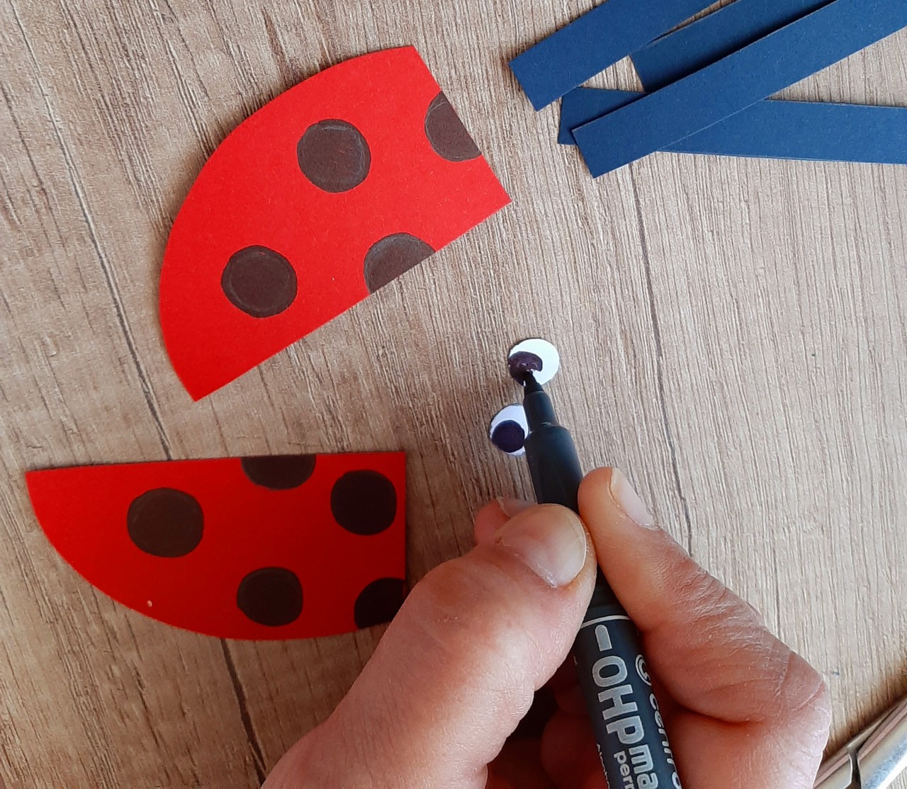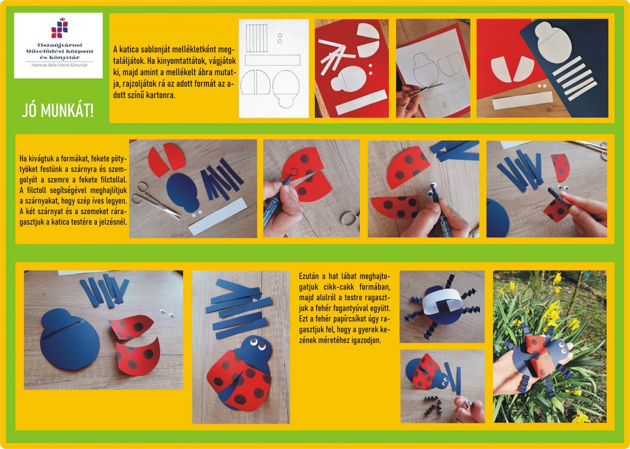 ? Ha kivágtuk a formákat, fekete pöttyöket festünk a szárnyra és szemgolyót a szemre a fekete filctollal. A filctoll segítségével meghajlítjuk a szárnyakat, hogy szép íves legyen. A két szárnyat és a szemeket ráragasztjuk a katica testére a jelzésnél.
