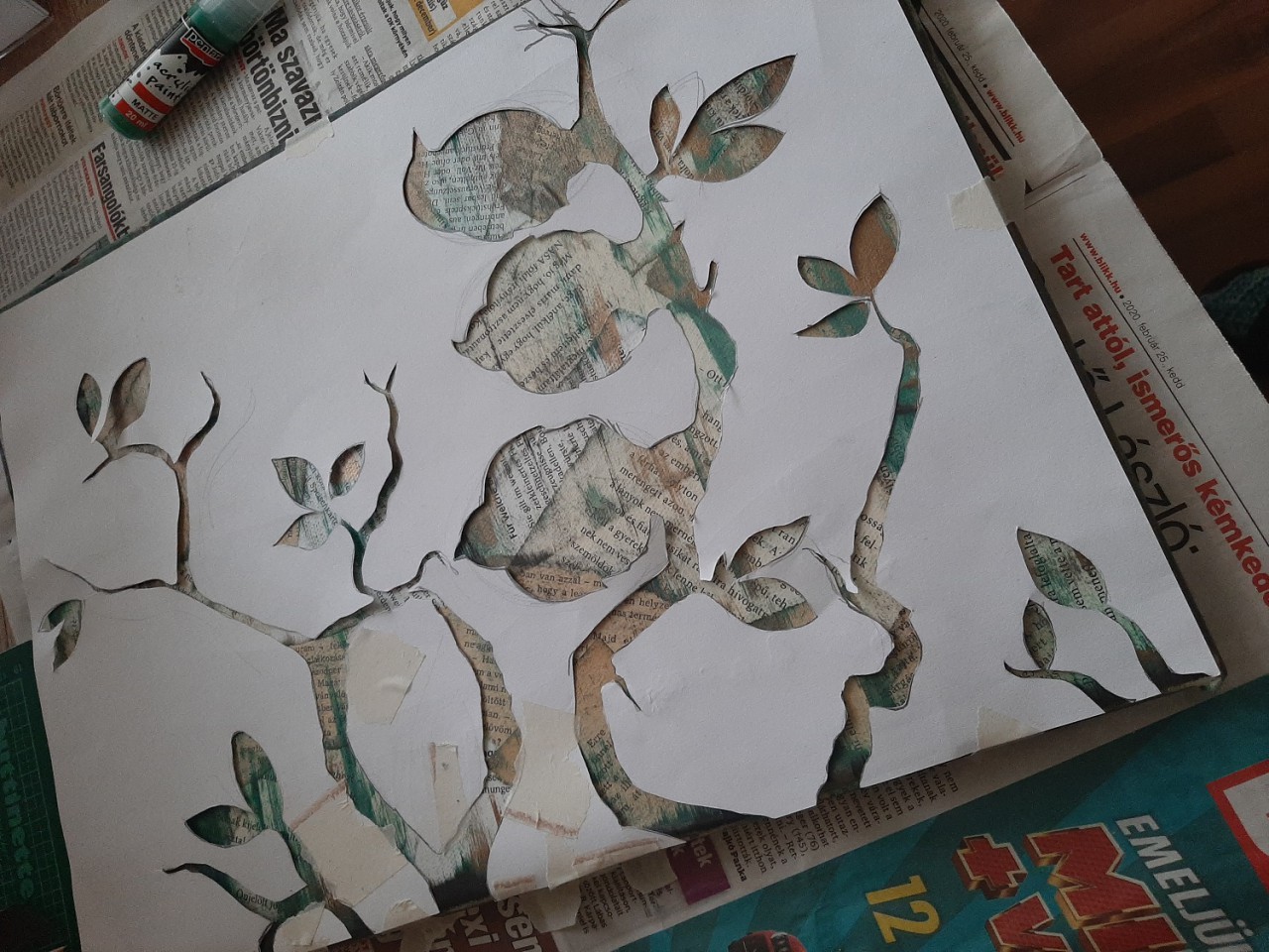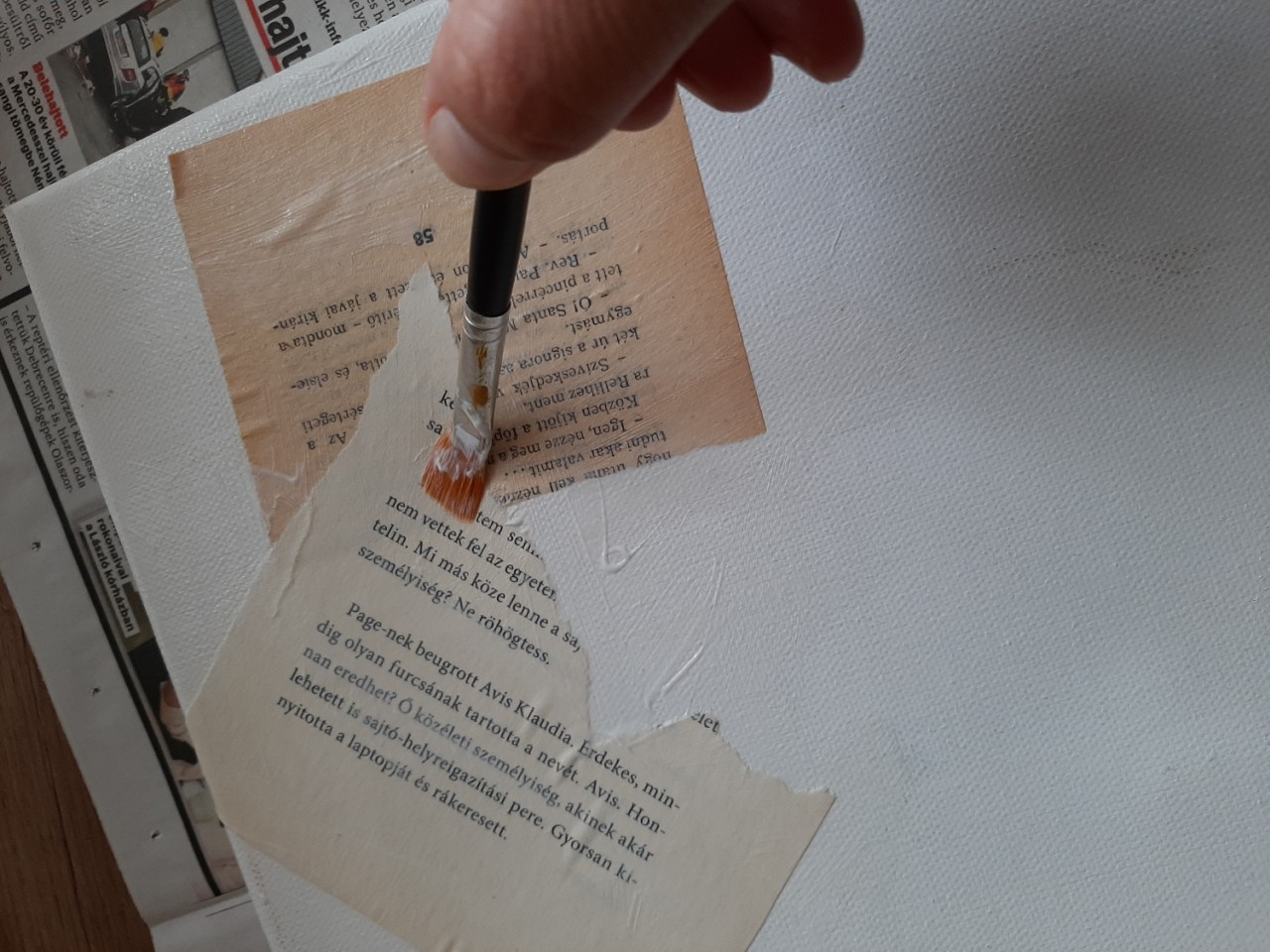 ? Az összegyűjtött régi könyvlapokat nagyobb darabokra szaggatjuk, majd a decoupage ragasztóval és az ecset segítségével felragasztjuk a vászonra.