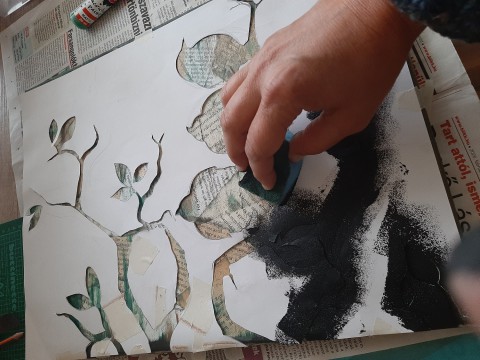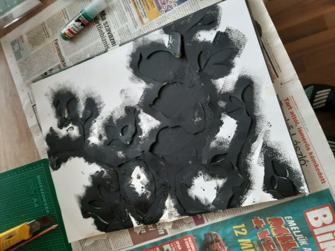 ? A szivacs segítségével felvisszük a viszonylag sűrűre kevert fekete festéket, majd ha kész vagyunk, levesszük a sablont a vászonról.