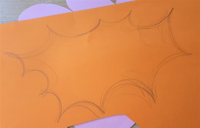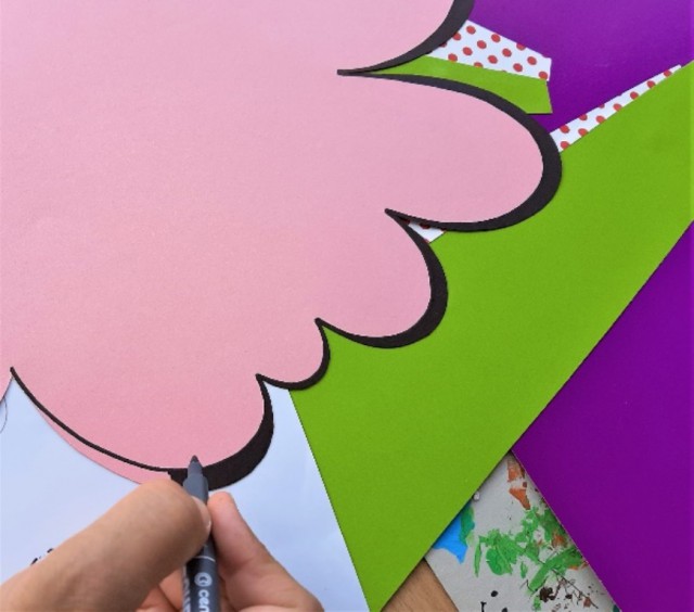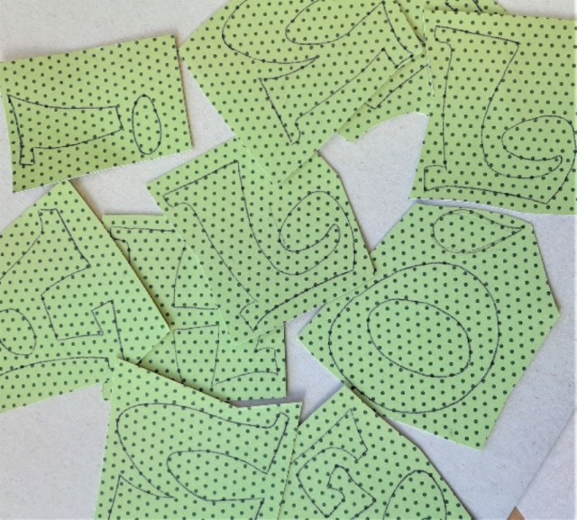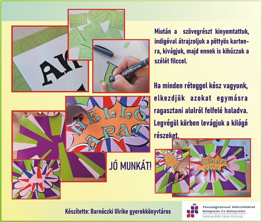 Miután a szövegrészt kinyomtattuk, indigóval átrajzoljuk a pöttyös kartonra, kivágjuk, majd ennek is kihúzzuk a szélét filccel.