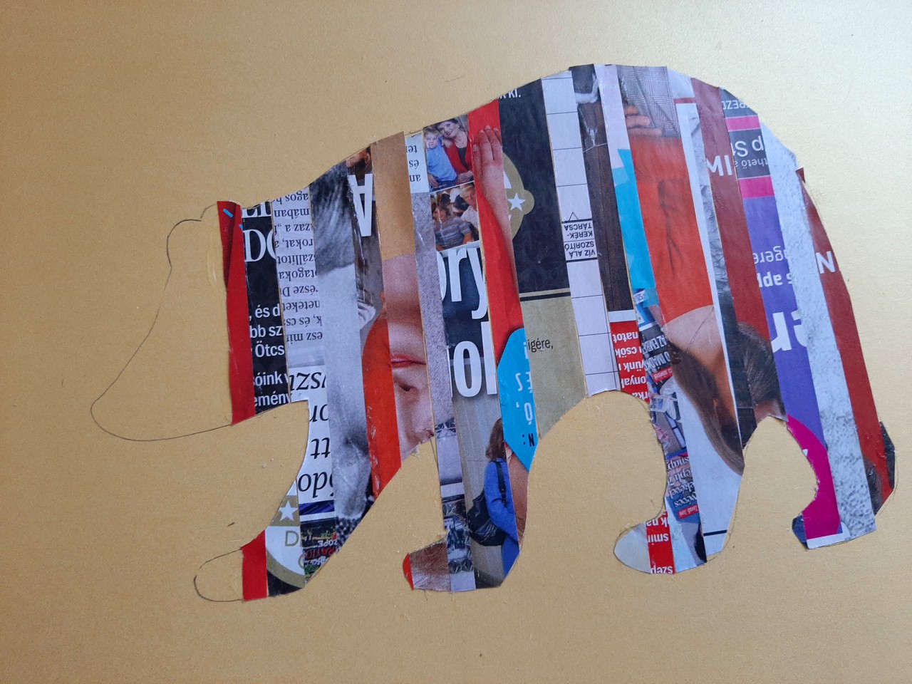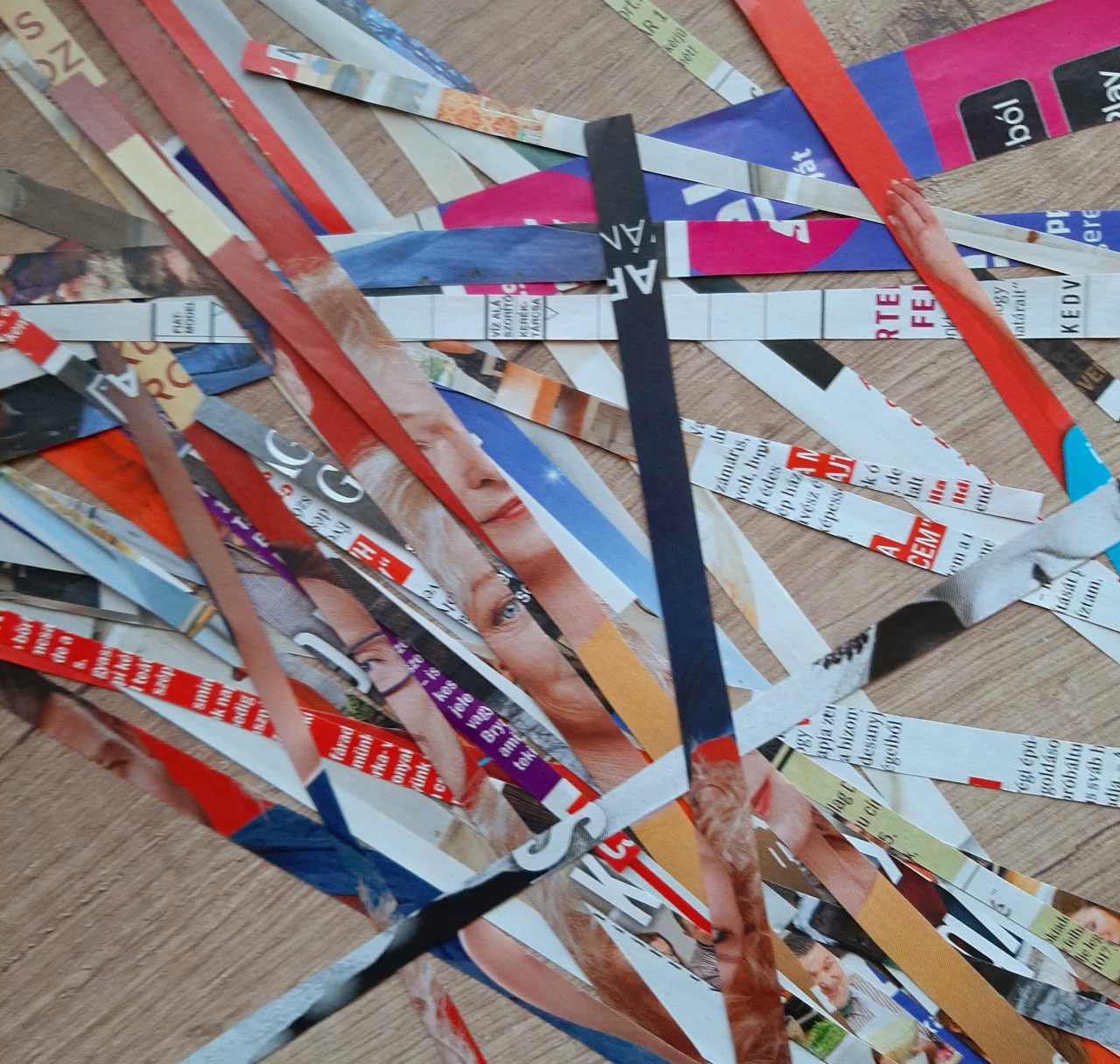 ✂️ A színes magazinból különböző vastagságú csíkokat vágunk ki, a fél cm-estől a másfél cm-es méretig. Próbáljunk meg színesebb és szöveges csíkokat is vágni, hogy minél változatosabb legyen majd az elkészült képünk. Én medve formát választottam de ti bármilyen állatot választhattok. ????