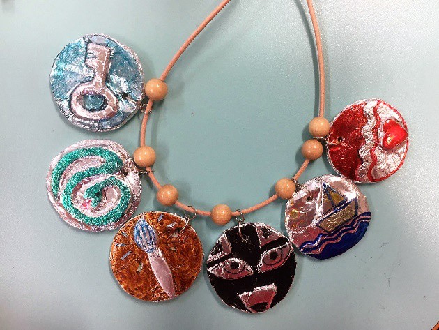 A tábor minden napját végig kísérte egy egyre bővülő nyaklánc, amelynek minden medálját az adott naphoz illeszkedő motívummal láttunk el.