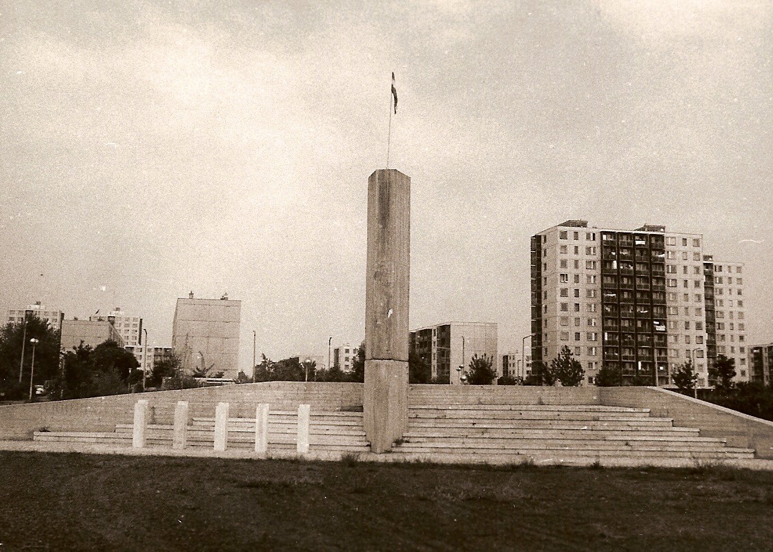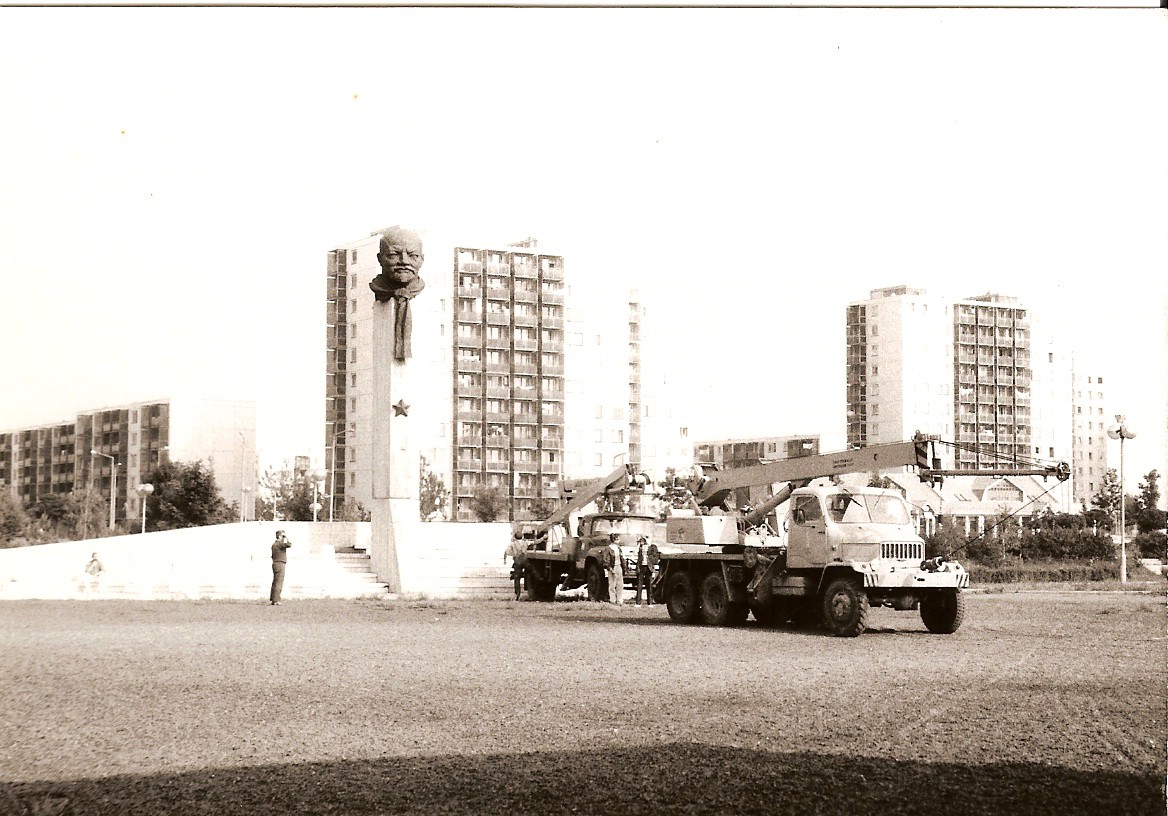 „1990. június 12-én a reggeli órákban eltávolították a Lenin fejet talapzatáról, azóta nemzeti zászlót lenget ott a szél."[6]