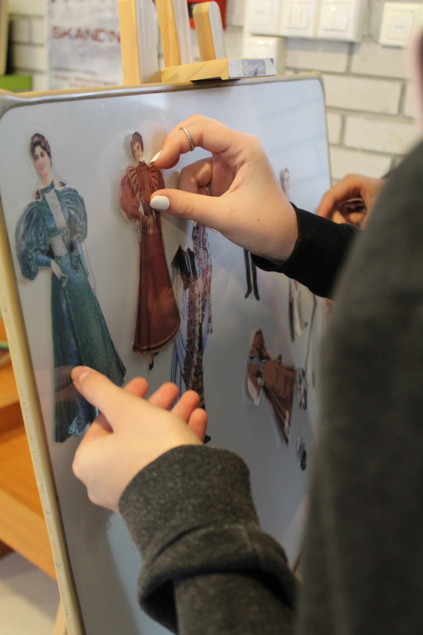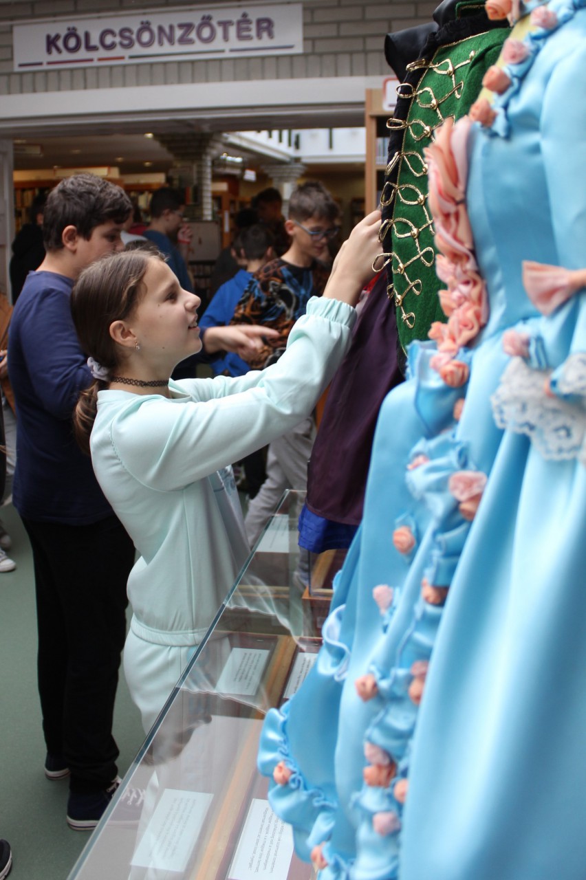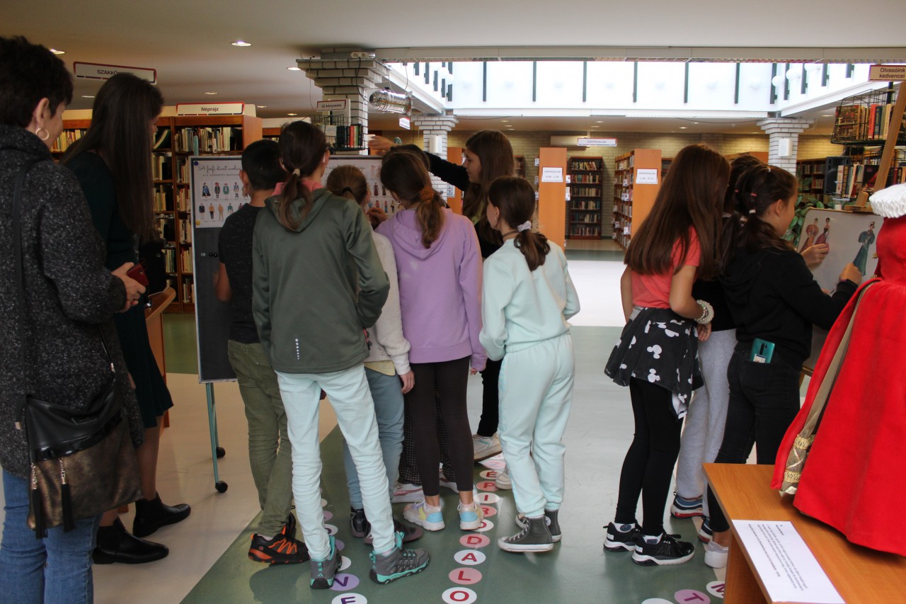 Október 14-én a Szent István Katolikus Általános Iskola hatodik osztályos diákjai vettek részt Ruha-tár című kamarakiállításunkhoz kapcsolódó foglalkozásunkon. A diákok először igen ügyesen, a könyvtári jelzetek adta segítséget is kihasználva megfejtették, melyik kosztüm, melyik irodalmi szereplőt/szerzőt rejti. Ezután a papír öltöztetős babákon keresztül ismerkedtek a különböző divattörténeti korszakokkal, majd a férfi és a női divat evolúciós idővonalán próbáltak rendet tenni.