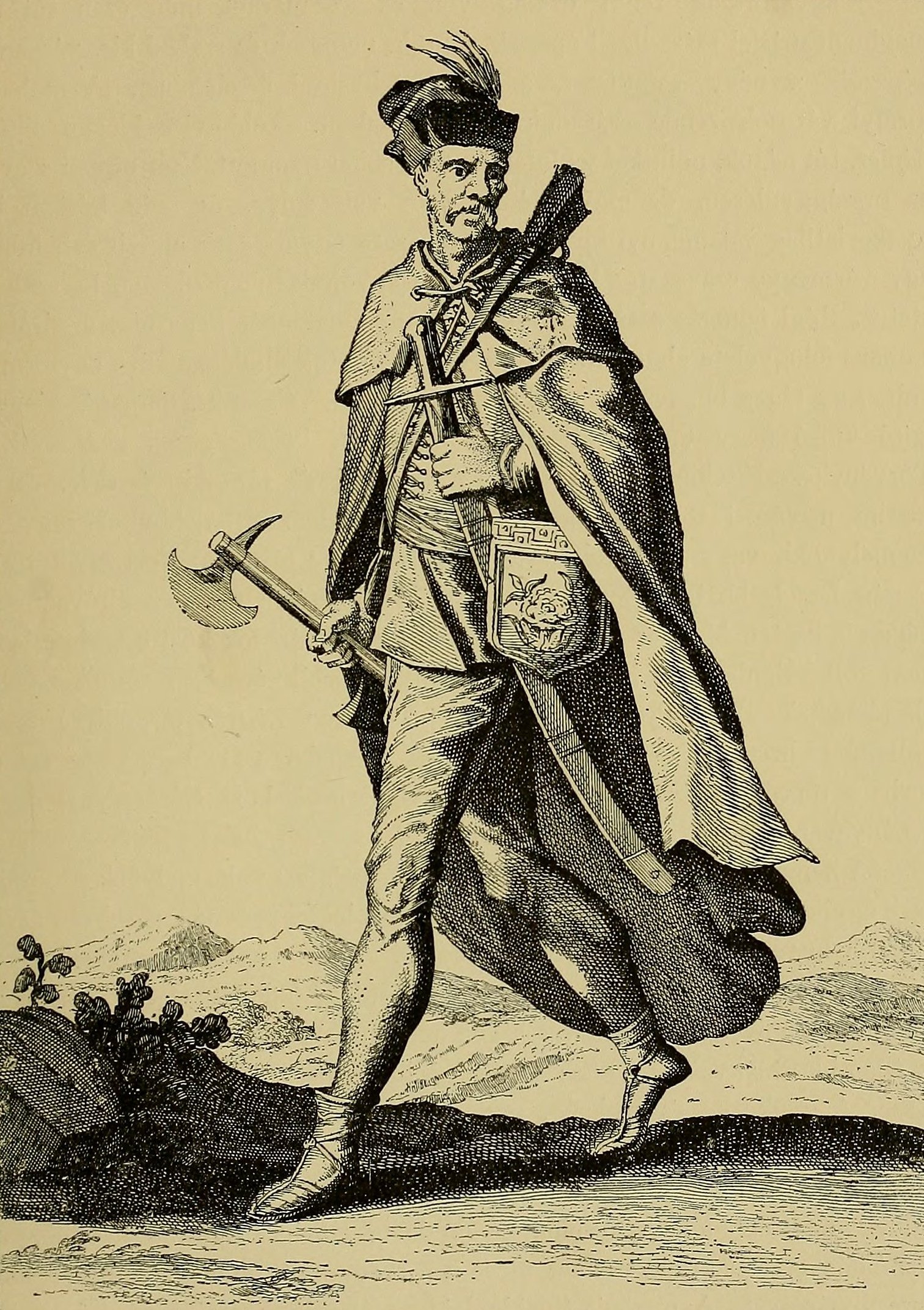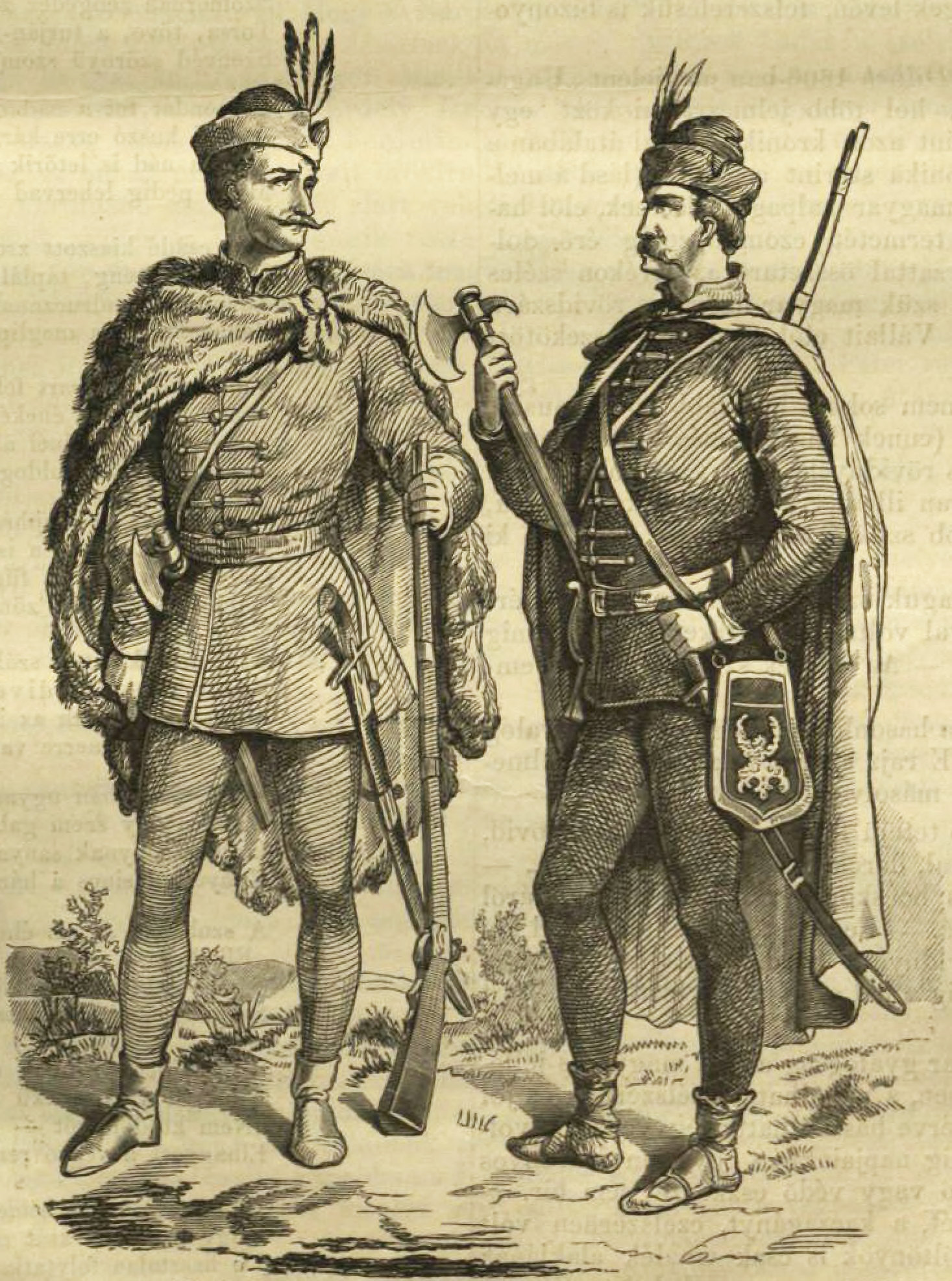 A hajdúk majdnem úgy öltözködtek, mint általában a magyar parasztok. Fegyverük szablya, kurta puska és jobb oldalukon az övben balta. Felső ruha gyanánt úgy ők, mint a huszárok kurta köpenyt viseltek. [»]