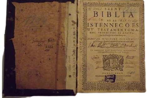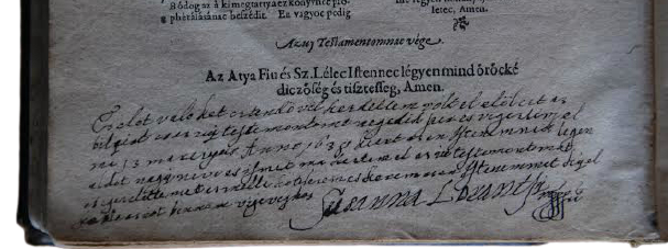 "Ez előtt való két esztendővel kezdettem volt el ezt a Bibliát és az Újtestamentumot negyedikszer és végeztem el 13 március Anno 1638, kiért az én Istenemnek legyen áldott a nagy neve, és ismét ma kezdtem el az Újtestamentumot és egész életemet e mellé köteleztem és kérem az én Istenemet aki elkezdte a jót bennem vigye véghez."