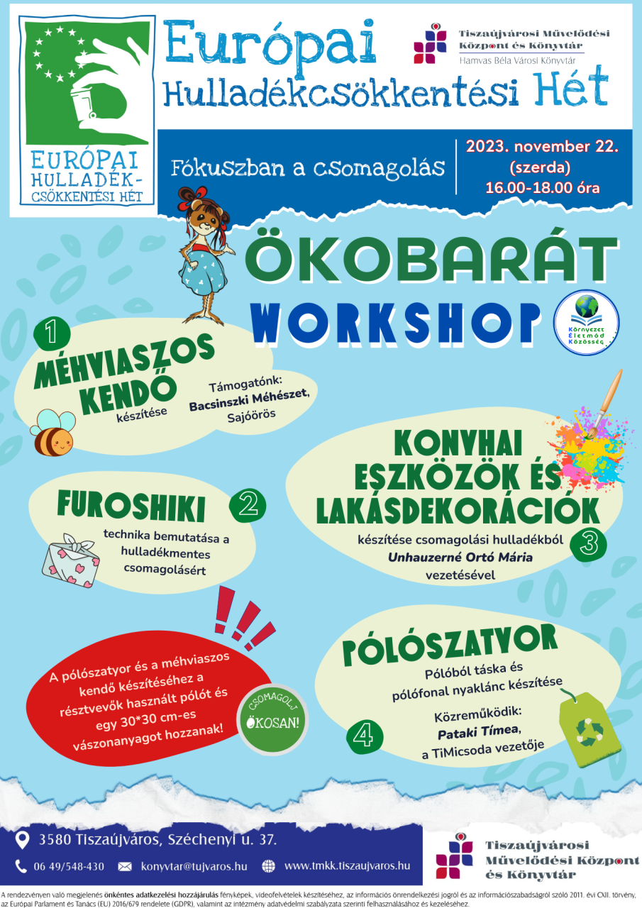 Idén novemberben már 15. éve kerül megrendezésre az Európai Hulladékcsökkentési Hét, melyhez könyvtárunk is csatlakozott. Minden évben más tematikát hirdetnek meg, 2023-ban a csomagolás került a középpontba. Ez azért is aktuális, mert a teljes műanyagfelhasználás 40%-a és a teljes papírfelhasználás 50%-a az EU-ban csomagolási célokat szolgál, és ezek jelentős része (36%-a) vész kárba, azaz végzi települési szilárd hulladékként.