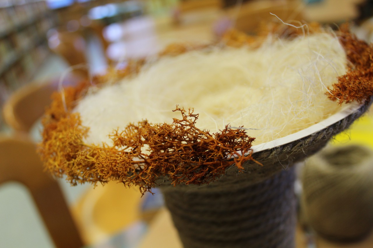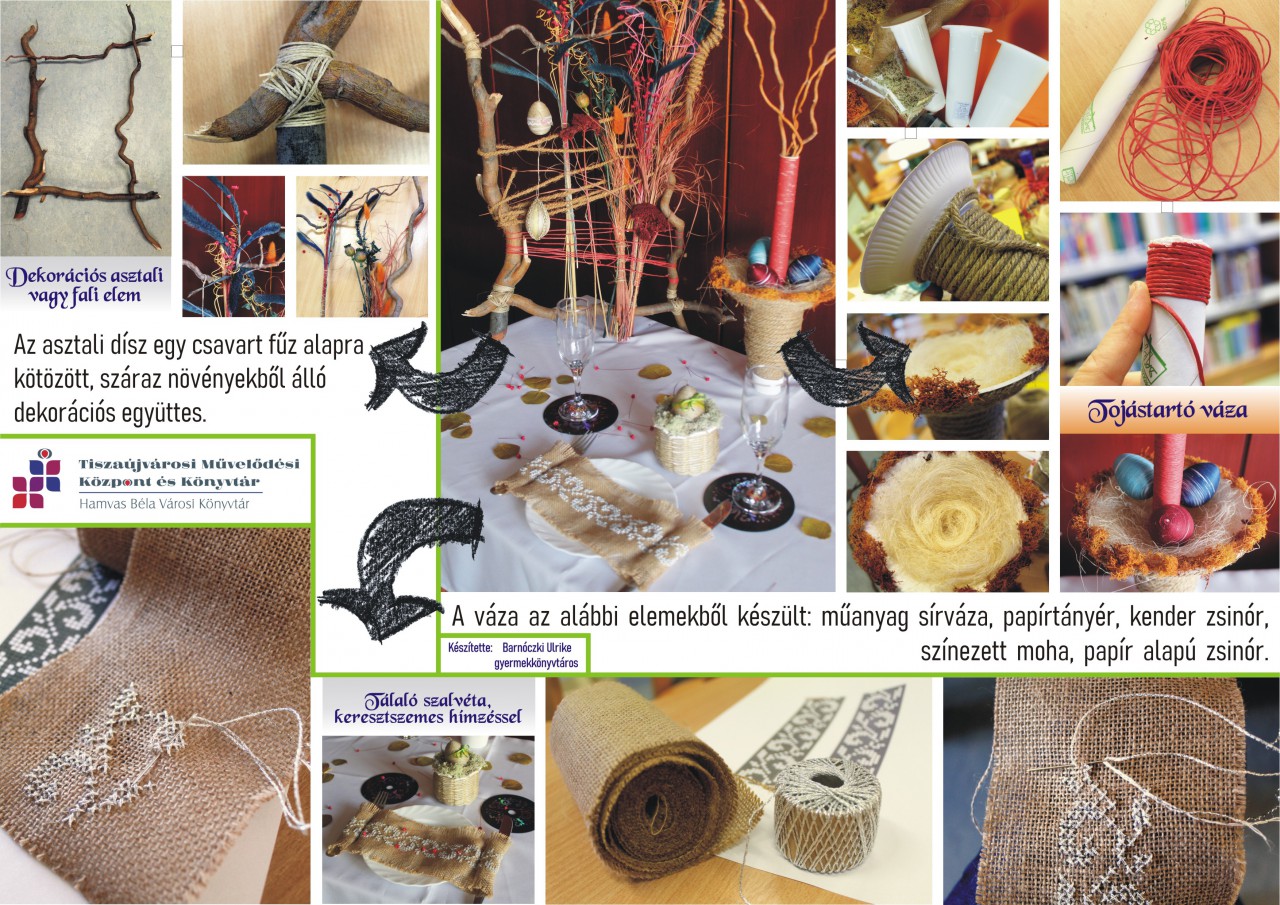 A váza az alábbi elemekből készült: műanyag sírváza, papírtányér, kender zsinór, színezett moha, papír alapú zsinór.