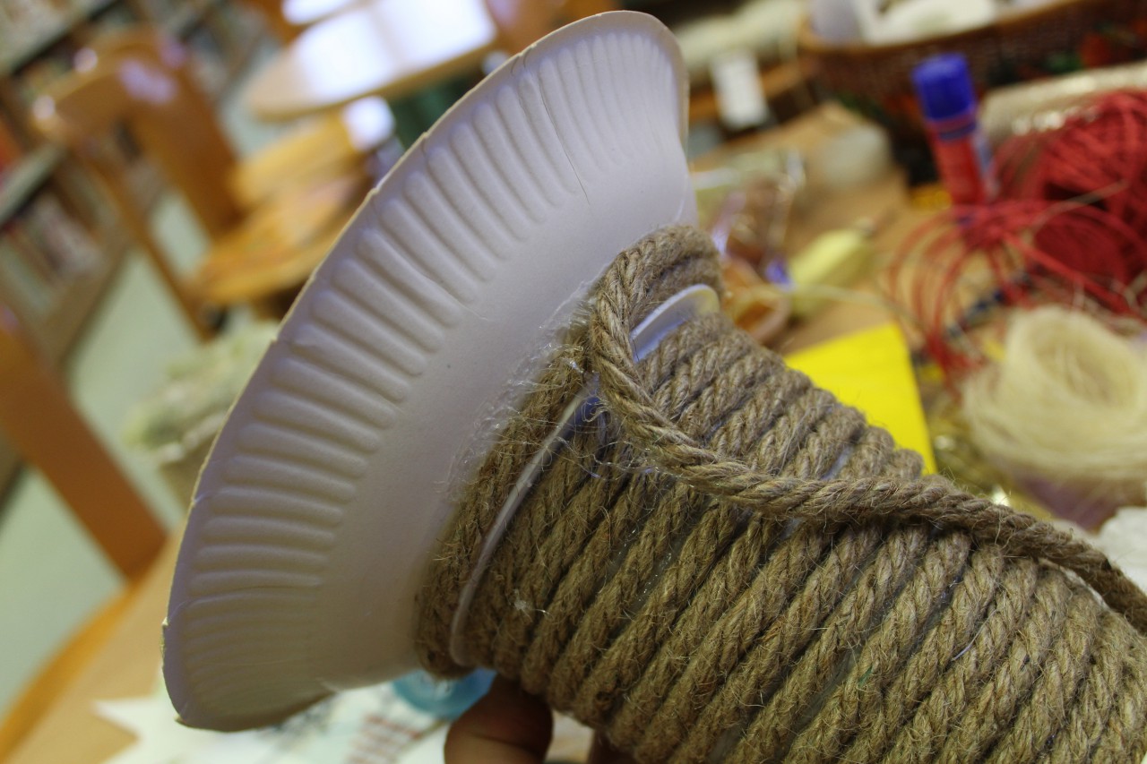 A papírpoharat páratlan számú sávokban bevágjuk, majd fejjel lefele lefordítva a zsinórt körben rátekerjük a mellékelt ábra szerint. A zsinór körültekerése folytán, a