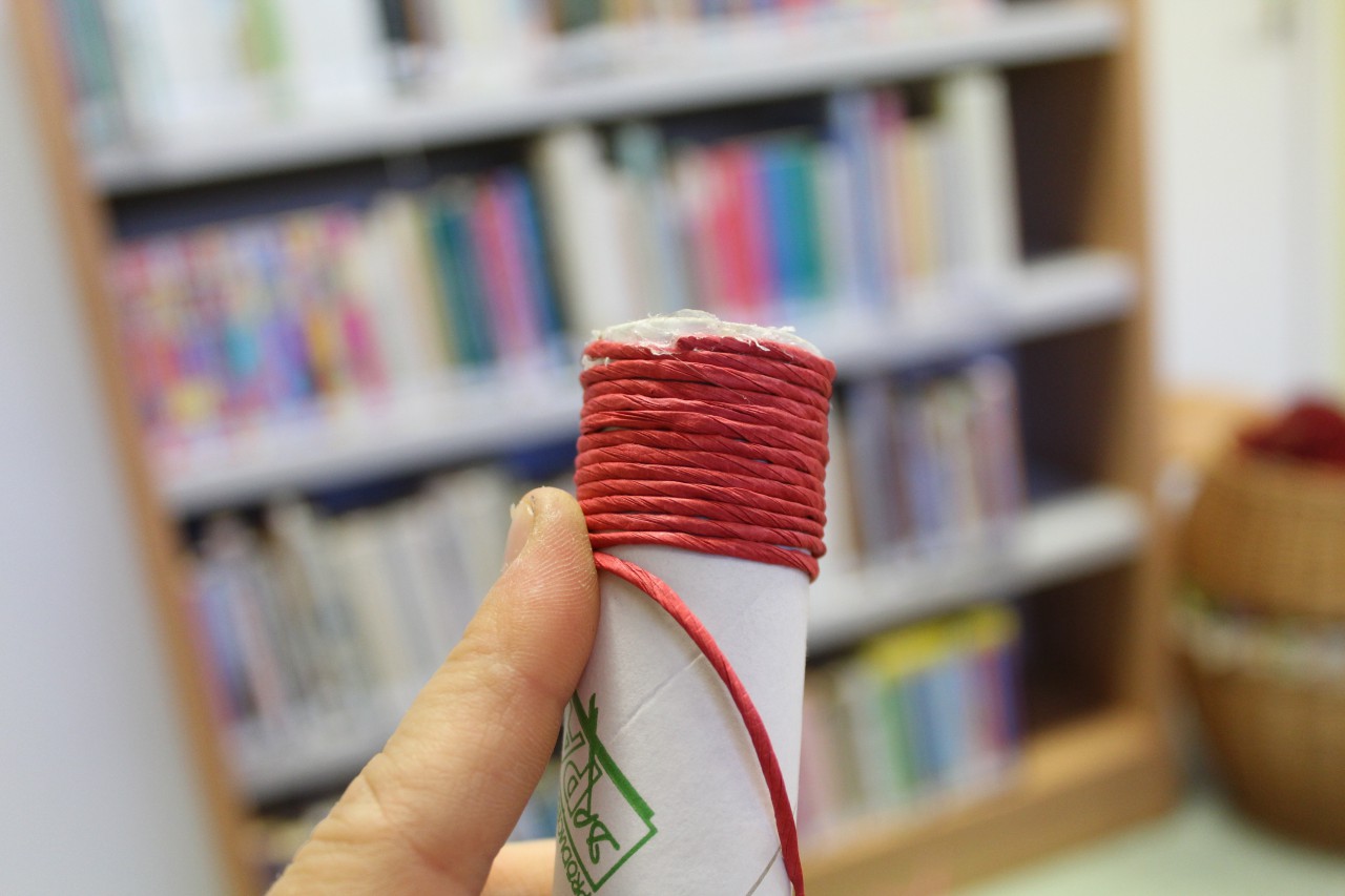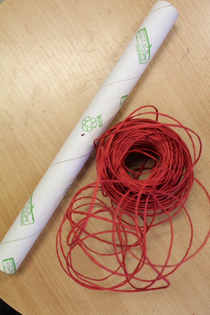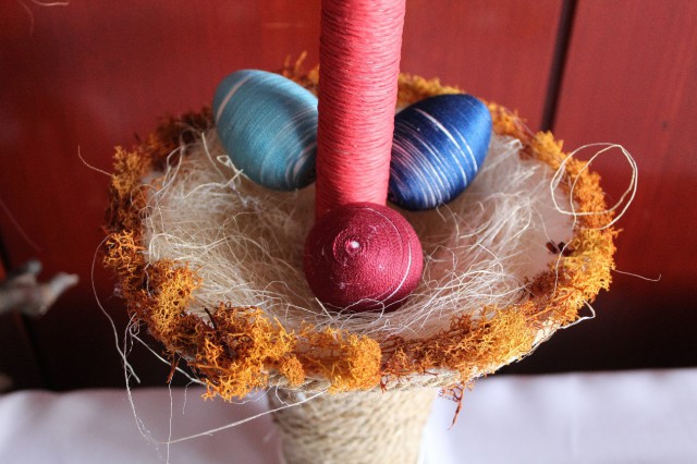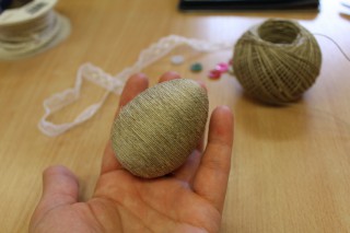 A hungarocell tojásra stift ragasztó segítségével spirálisan rátekerjük a zsinórt úgy, hogy a kezdésnél egy tűvel lyukat szúrunk a tojás végébe és abba helyezzük a zsinór végét.
