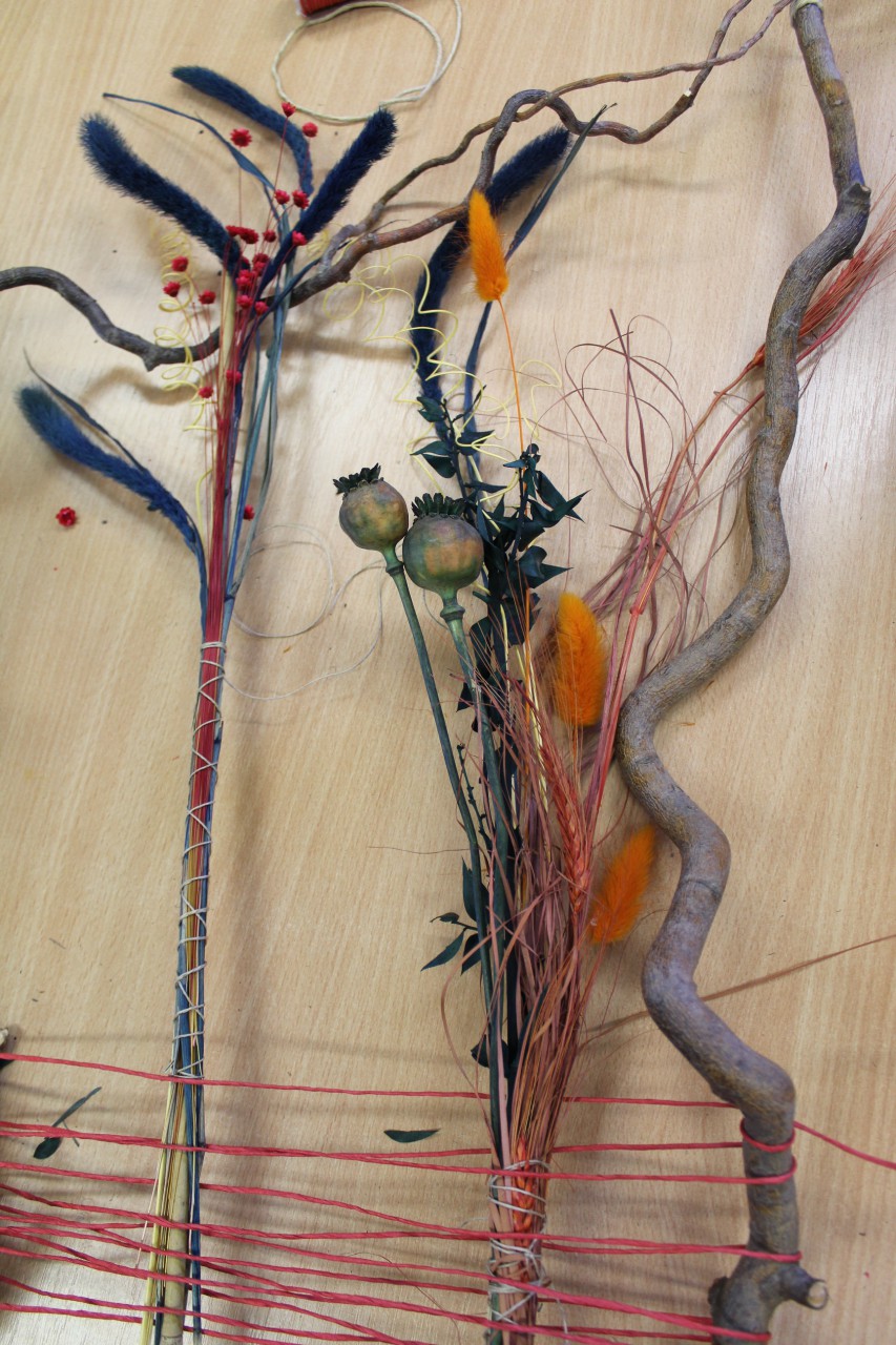 Az asztali dísz egy csavart fűz alapra kötözött, száraz növényekből álló dekorációs együttes.