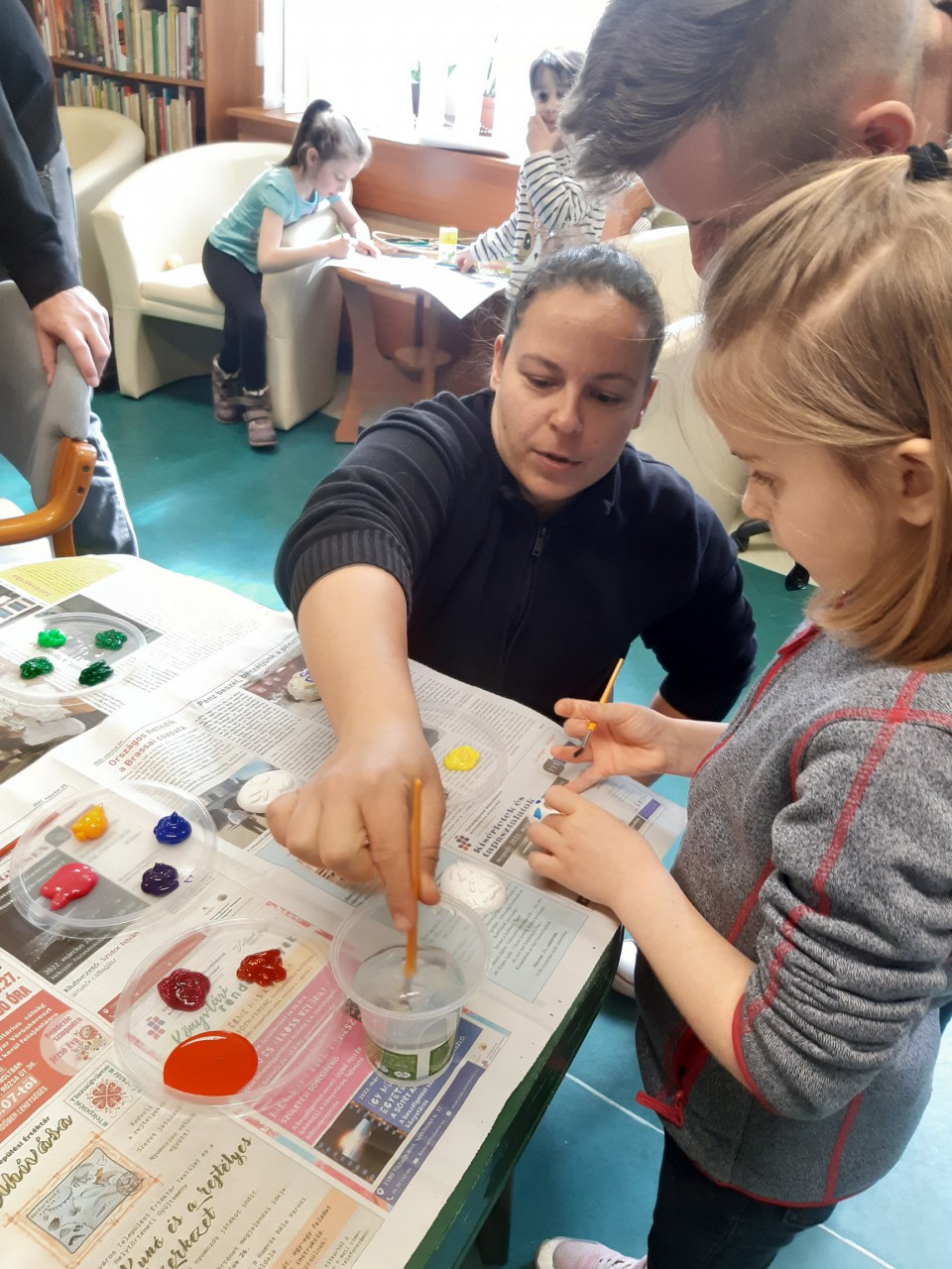 Húsvéti kézműves játszóházban készülhettek az ünnepre azok a gyerekek és szüleik, akik ellátogattak 2022. április 10-én a Tiszaparti Fiókkönyvtárba. A kézműves asztaloknál díszes tojások, húsvéti díszek és még sok más színes, tavaszi ötlet kelt életre a szorgos gyermekkezek által. Az ajándékokat a gyerekek örömmel vitték haza. Az alkotó délelőtt záró programja a tojásfa díszítés és a tojáskeresés volt. A fűben rejlő kincsek felkutatását a gyerekek nagyon élvezték. Kicsiknek és nagyoknak, gyerekeknek és szüleiknek, az egész családnak remek lehetőség volt arra, hogy belopják a mókát és a játékosságot valamint az ünnep hagyományait a mindennapjaikba.