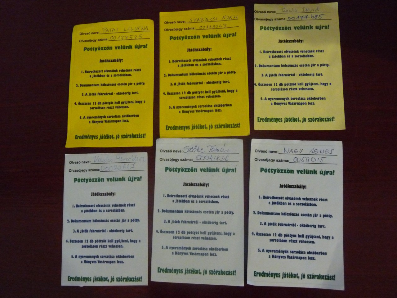 2019. februárjában indítottuk útjára "Pöttyözzön velünk újra" nyereményjátékunkat, mely során minden kölcsönzést pöttyel jutalmaztunk. A részvételi feltétel az volt, hogy beiratkozott olvasóink februártól októberig 12 alkalommal éljenek a kölcsönzés lehetőségével. Aki ezt teljesítette, és gyűjtőfüzetét telepöttyözte, sorsoláson vehetett részt.