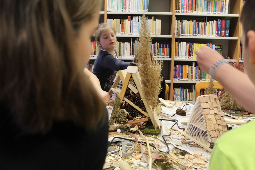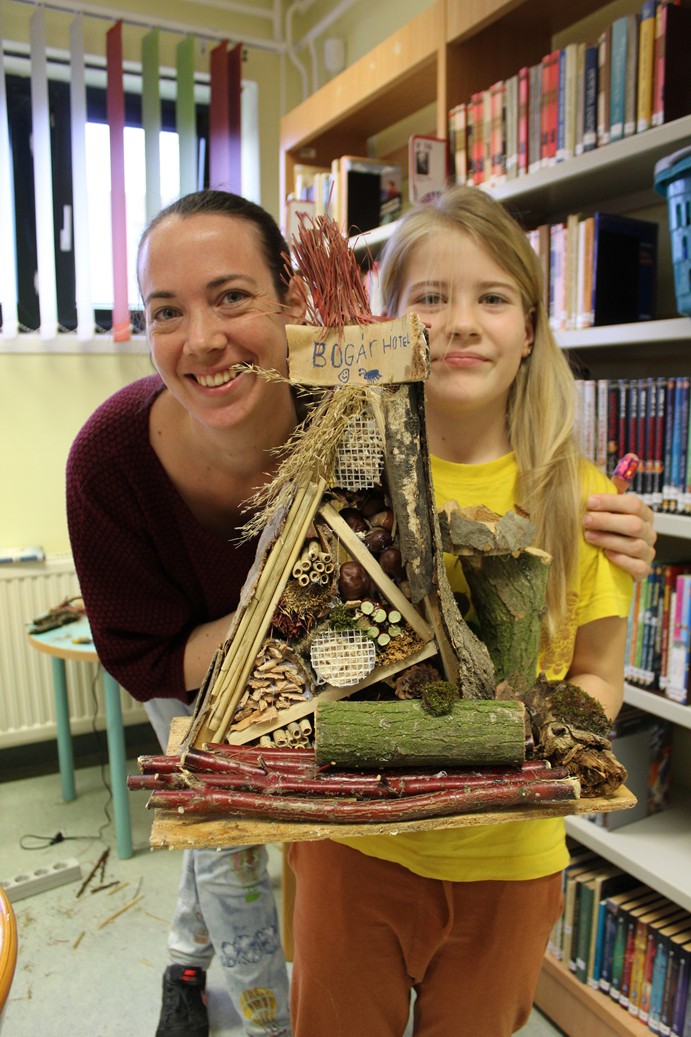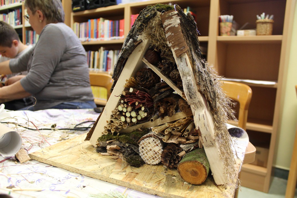 A rovarhotelbe nagyon sokféle anyagot építhetünk be, de mi törekedtünk arra, hogy azok természetes eredetű és környezetbe illőek legyenek. A rovarhotel készítése minimális költségráfordítással is megoldható, csak nyitott szemmel kell járni a városban, a parkokban, az erdőben. Gyűjtöttünk kicsi tobozokat, gallyakat, nádat, faháncsot, mohát. A rovarhotelnek mindenképp alakítsunk ki tetőt, hogy védve legyen a csapadéktól. Mi több szintet (emeletet) és elválasztót hoztunk létre. Tehetünk bele kérges farönk szeleteket különböző vastagságban, melyekbe lyukakat fúrunk, a magányos méheknek és darazsaknak alakítva ki a darázsgarázst. Másik részbe sűrűn összerendezett ág- vagy kéregkötegeket, esetleg szorosan összekötözött nádszálakat rakhatunk.