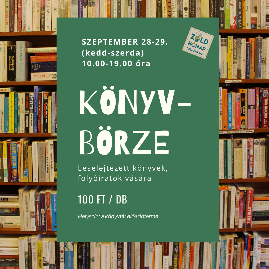 A Zöld hónap programjaként, az újrahasznosítás jegyében szeptember 28-29. (kedd-szerda) 10.00-19.00 óra között Könyvbörzét tartunk a könyvtár leselejtezett dokumentumaiból. A könyvek és folyóiratok 100 ft/db áron vásárolhatók meg.