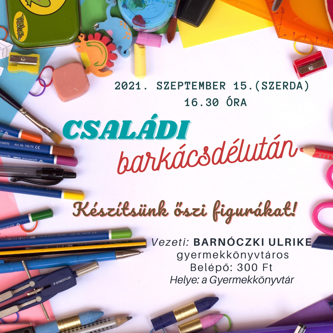 A gyermekek számára is számos programot kínálunk. Szeptember 2-án (csütörtök) 16.30-tól a kisiskolásokat várjuk Rajzolj és alkoss velünk! című tehetséggondozó foglalkozásunkra. A gyerekek színes madarakat készíthetnek kollázs technikával. Szeptember 8-án (szerda) 10.00 órakor a kicsiké a terep, a Babusgató baba zenebona alkalmával babák és mamák együtt mondókázhatnak foglalkozásvezetőink irányításával. A Családi barkácsdélutánon szeptember 15-én (szerda) 16.30 órától őszi figurák készítésével hangolódhatnak az őszre a családok.