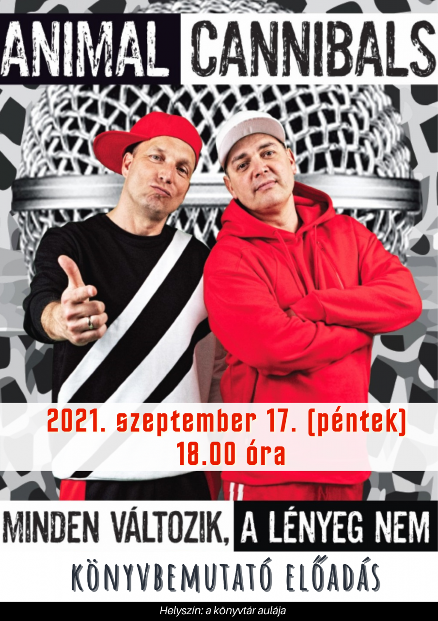 Különleges programnak ígérkezik szeptember 17-én (péntek) 18.00 órától a népszerű Animal Cannibals együttes könyvbemutató előadása. Az „állat kannibálok" Minden változik, a lényeg nem címmel önéletrajzi könyvet írtak, melyet most személyesen hoznak el nekünk. A fiúk a könyvben részletesen mesélnek karrierjükről, tehetségkutatóikról, tévés műsoraikról, és betekintést engednek az eddig ügyesen eltitkolt magánéletükbe is. A könyv egyszerre életrajz, lexikon, képeskönyv és kalandregény. A bemutatón a kannibálok zenélni nem fognak, azonban a szerencsések haza is vihetnek magukkal egy ajándék példányt a könyvből…